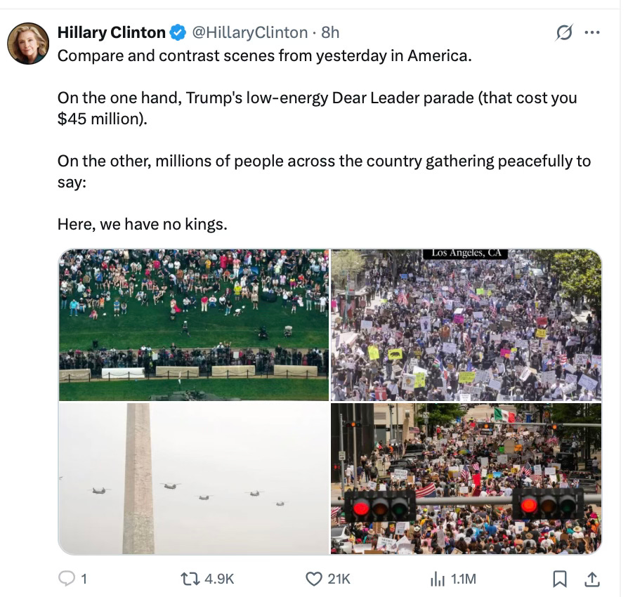 No Kings? We just had an election. Trump won squarely. So he’s no Royal - he’s the people’s choice. Meanwhile, the Democrats’ candidate was anointed without electoral process. After the lies about Biden’s poor health were exposed. And wait, wasn’t Biden also essentially anointed in SC after it looked like Bernie might win? It’s the Dems who circumvent democratic process. Again and again. The fact is they so hate to lose they attack the winner, and ICE. And they’ve lacked respect for the Army for over 50 years.