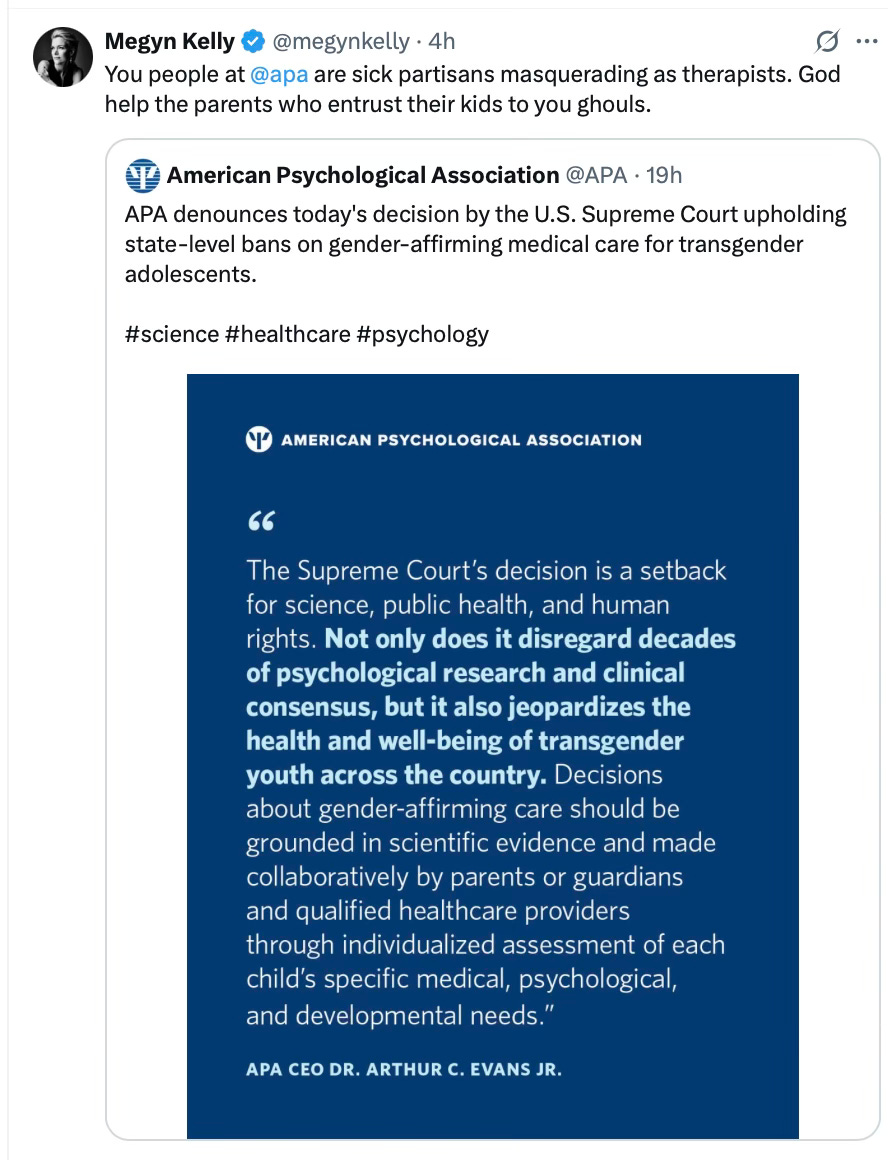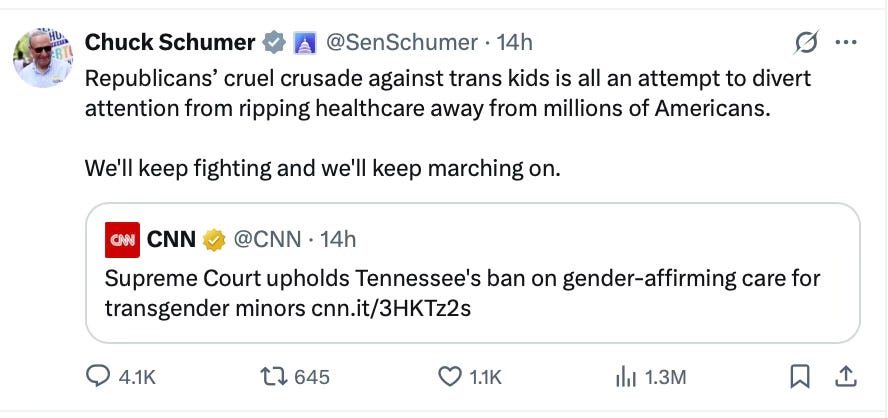 I don’t think abortion should be illegal. But you know what should be? “Gender-affirming care” for minors. That is the most grotesque example of soft language ever invented by my former side. Call it what it is - sterilization. Top surgery is a double mastectomy. Bottom surgery is castration.