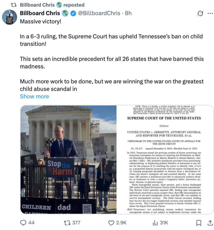 Matt Walsh has been relentless. He’s not only reported on the horrors of “gender-affirming care” on his show but also appeared in town halls and government, and helped push the fight in Tennessee to ban the practice. He deserves much credit today.