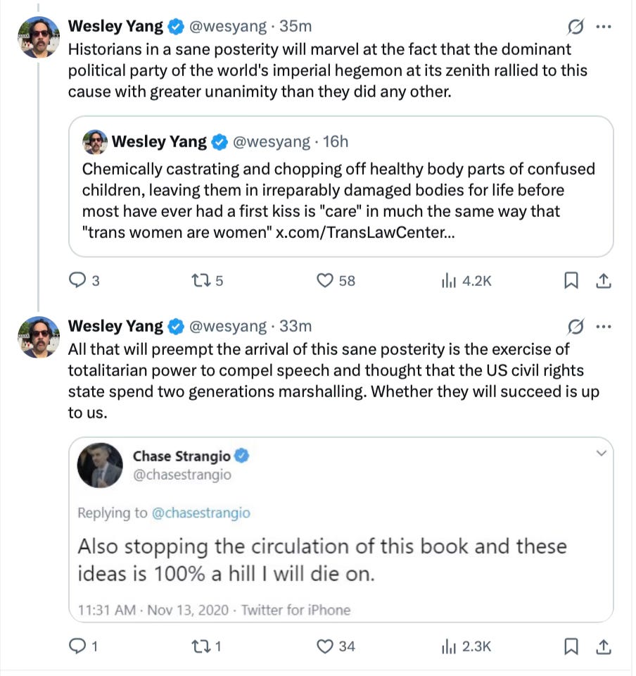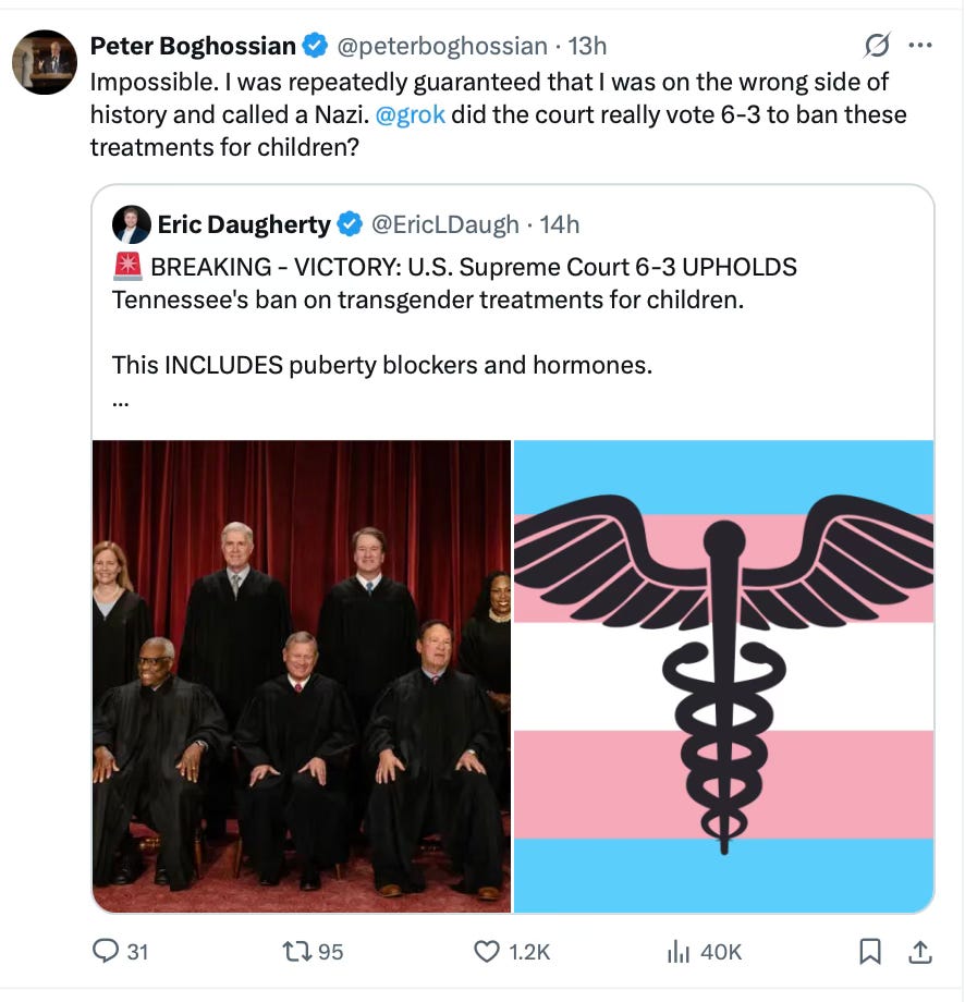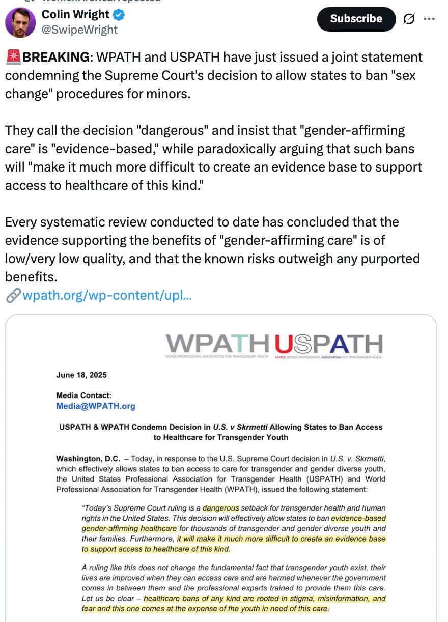 Because they were sacred and this was special, everyone had to walk on eggshells. Every news outlet was commanded to comply, and they obeyed. It took years before the New York Times posted even one critical story of “gender affirming care.” Forget NPR and PBS. They were and mostly are still fully captured.