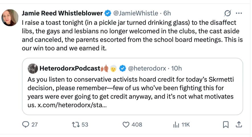 pod with Jesse Singal and Katie Herzog, like . And of course, Jamie Reed and :Their voices should not be discounted. They have also been out there talking to legislators, testifying, and ensuring bills are passed. They understand that it’s only the Republicans, but they hope to convince Democrats someday.