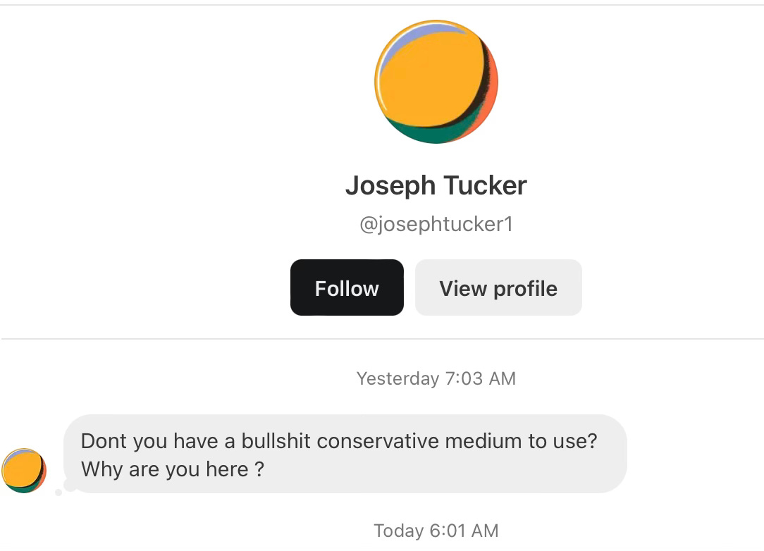 to find me here. Perhaps he stumbled over the story in the New York Times and thought in shock and horror, why is THAT PERSON on Substack?Joseph speaks the truth. Substack is not a “bullshit” Conservative medium. All you have to do is look at the leaderboard to see that. It’s mostly left-leaning outlets now, with a few exceptions. Perhaps they got bored with Threads and Blue Sky and were chased off of X and so now they’ve invaded Substack. Now they think Substack belongs only to them.
