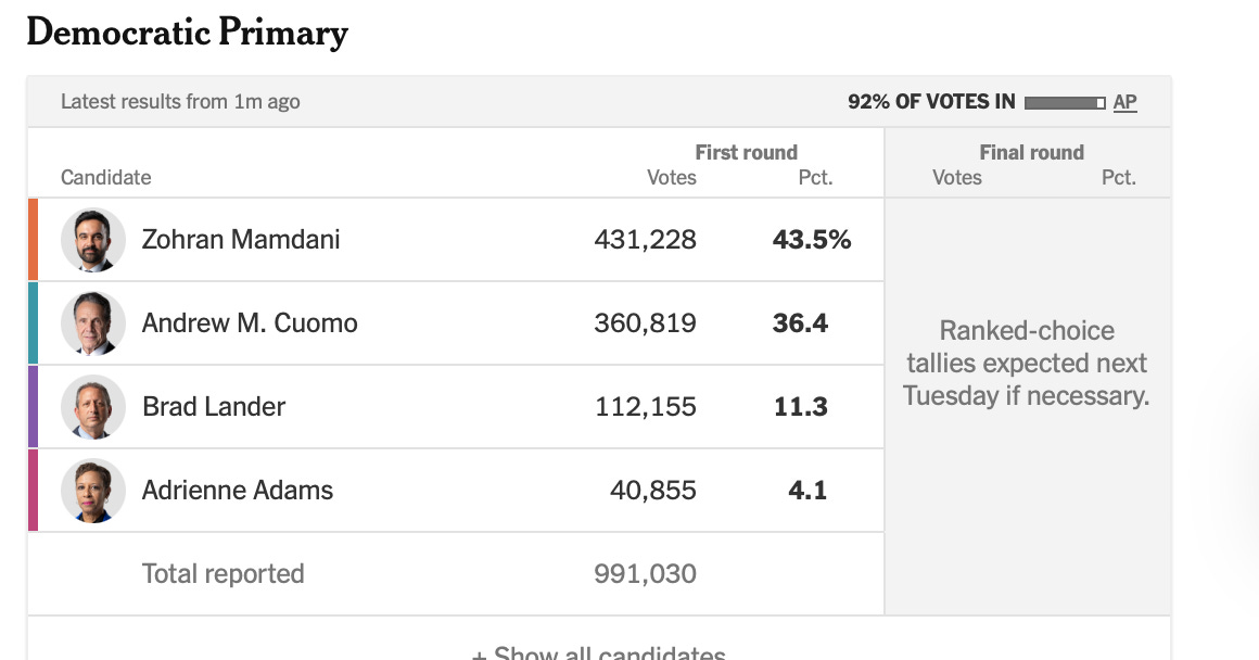 It looks like Zohran Mamdani has defeated Andrew Cuomo in the Democratic primary. Andrew Cuomo has essentially conceded before the ranked choice counting can even being: