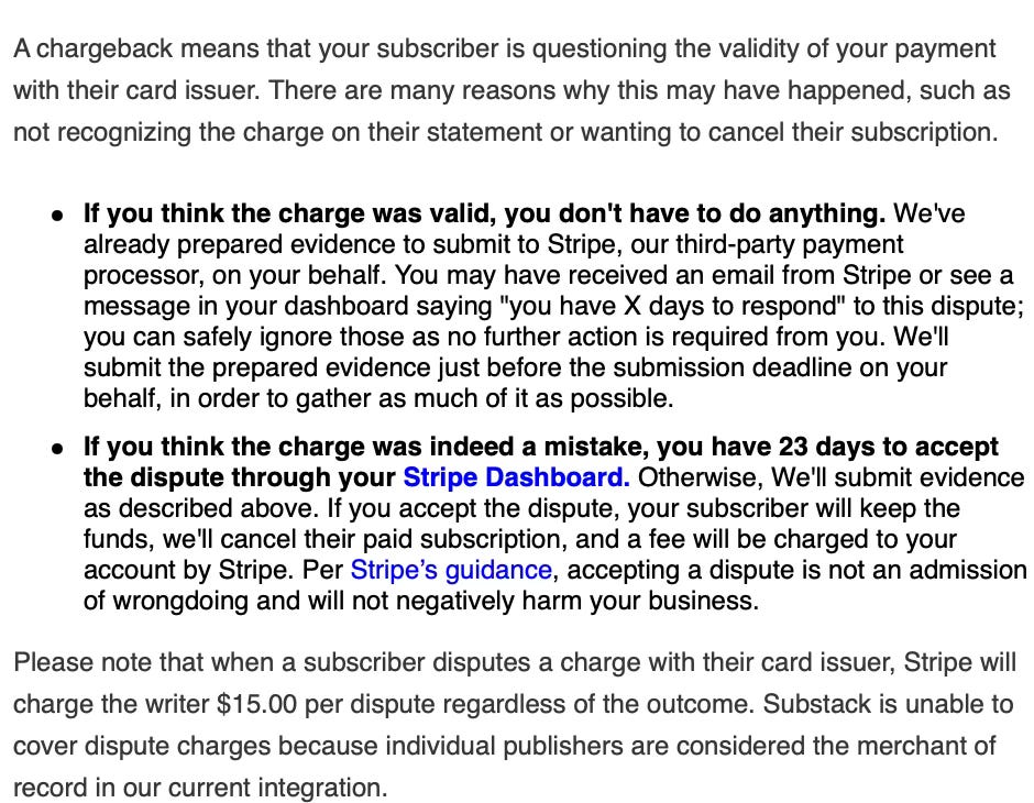 The problem is that I get charged every time one is initiated. Substack charges me $15, no matter the outcome. They never side with the writer. They always side with the customer, even though I had absolutely nothing to do with their subscribing in the first place.