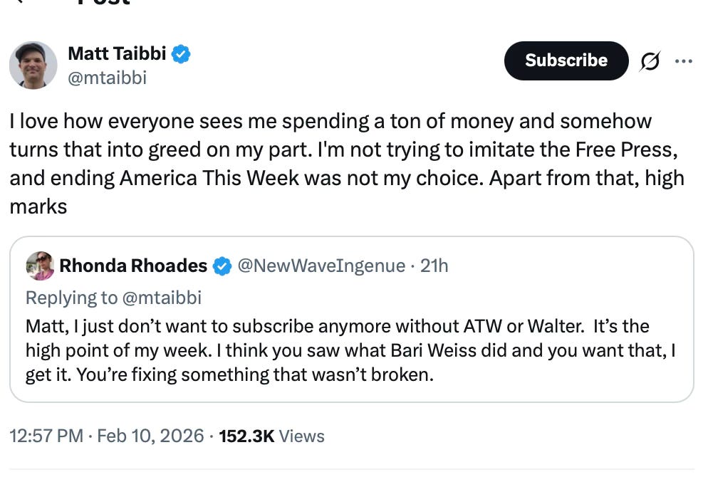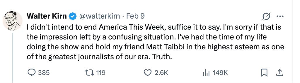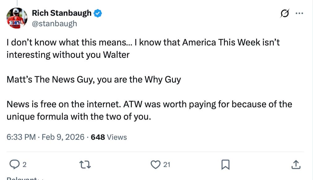 I will continue to follow Matt and Walter wherever they land. Matt will still be writing at Racket, and he says he’ll be doing even more of it. Walter will be on X and on Walter Kirn, and he is still writing books and screenplays. I’m sure both will be doing interviews, and who knows, maybe podcasts. But America This Week, at least as of right now, is done.