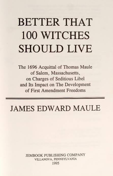 Maule would have spent his life in jail with his pamphlet banned had he not demanded to be tried in front of a jury of his peers in Salem. He argued before the court and was found Not Guilty.