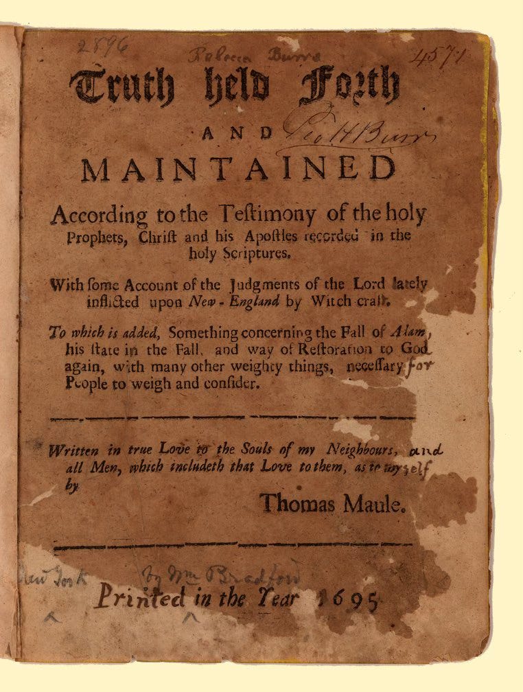 And then, after the mass hysteria and the hangings in Salem, Maule wrote yet another pamphlet against the Church, called Truth Held Forth and Maintained, directly accusing the Chruch of going against God: