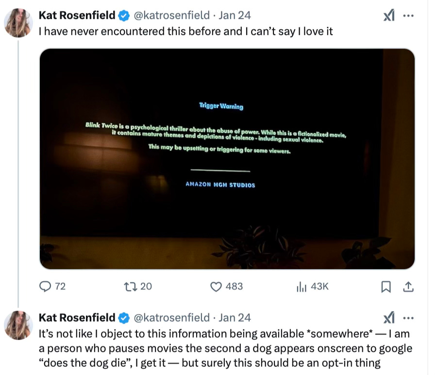 We’ve seen how books by JK Rowling and Dr. Seuss have been left off of reading lists, how warning labels have been affixed to movies because the Intolerant Liberals are so afraid of one person’s mental breakdown and ensuing social media backlash that they play it safe. Here is a screenshot of a trigger warning, posted by Kat Rosenfield: