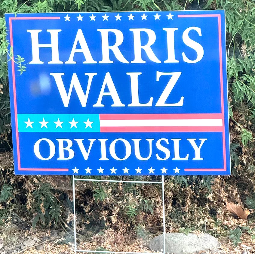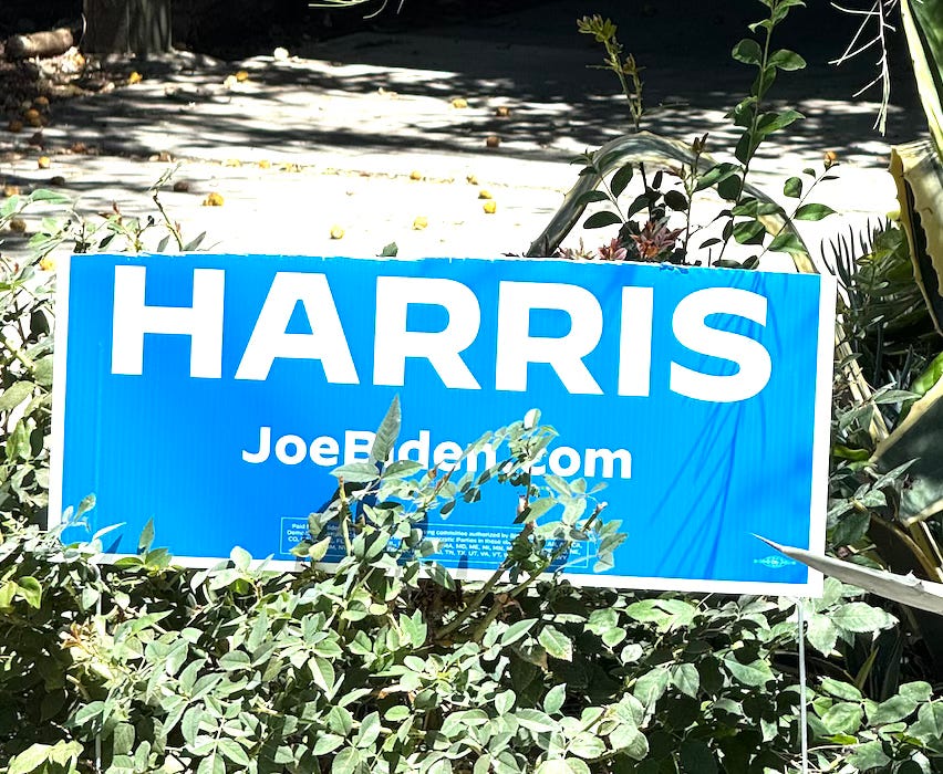 Janet had five Harris/Walz signs on her lawn. One of them was just an old Biden/Harris poster, which she ripped off the top where Biden was. It was a perfect metaphor for the election: Rip off the old white guy’s name and elevate the woman of color. It didn't matter that there wasn't a primary. When you have to save the country from rising fascism, you do what you must.