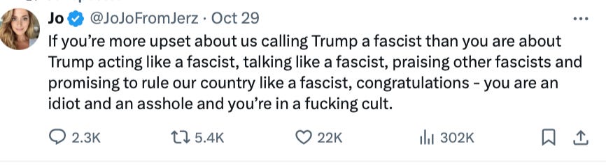 Janet knew in her mind that she wouldn't be fine. She knew her entire world would come apart, and maybe she wouldn't even survive this time. She could move out of Vista Butte even though probably 99% of the town will vote for Harris. But still, how does she just exist every day, knowing that half of her country could vote for a fascist, a racist, an adjudicated rapist, a felon, a criminal, a monster?