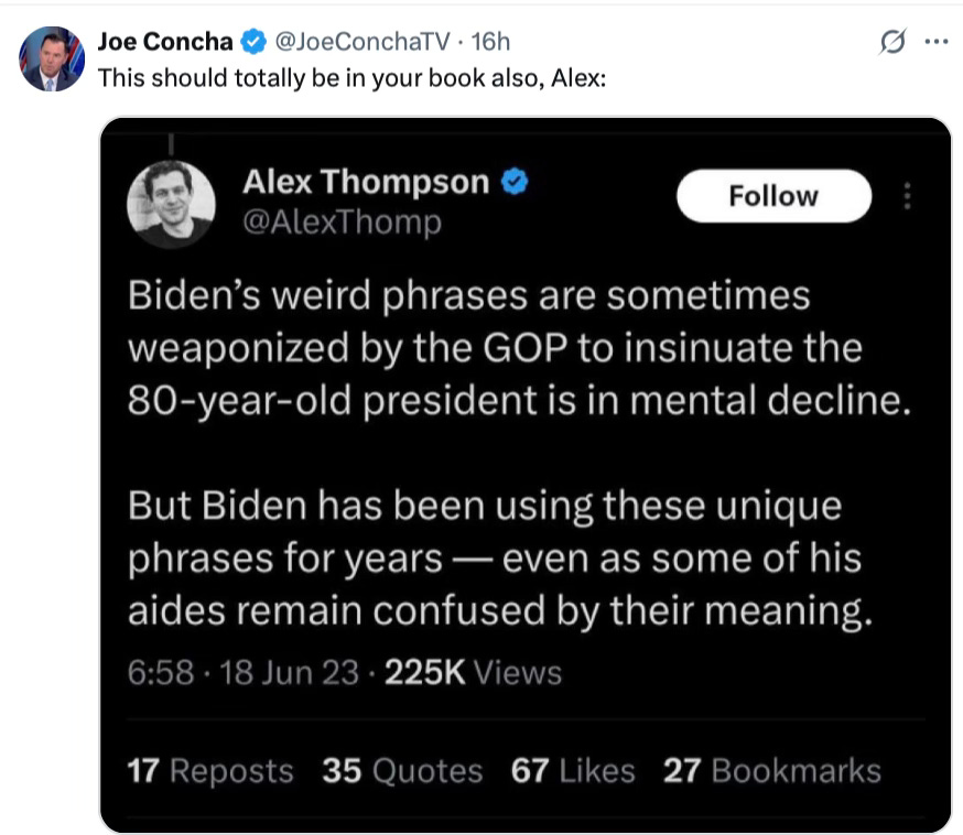 Jake Tapper and Alex Thompson writing an exposé of the conspiracy and cover-up to hide Joe Biden's cognitive decline is like the Watergate burglars writing a book about Nixon's alleged corruption. The conspiracy and cover-up are coming from inside the house.