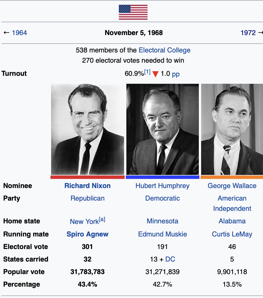 Richard Nixon was the beginning of the end for the 1960s, because he spoke for the majority of Americans who could not and did not speak for themselves. The news was consumed by the anti-war and civil rights protests. The Democrats, now that LBJ was so unpopular he declined running for a full second term, were in complete disarray, with Hubert Humphrey representing the Kennedy administration, against Eugene McCarthy, the anti-war activist and notable party split with the blue dog democrats who wanted to hold on to their white supremacy in the Southern states.
