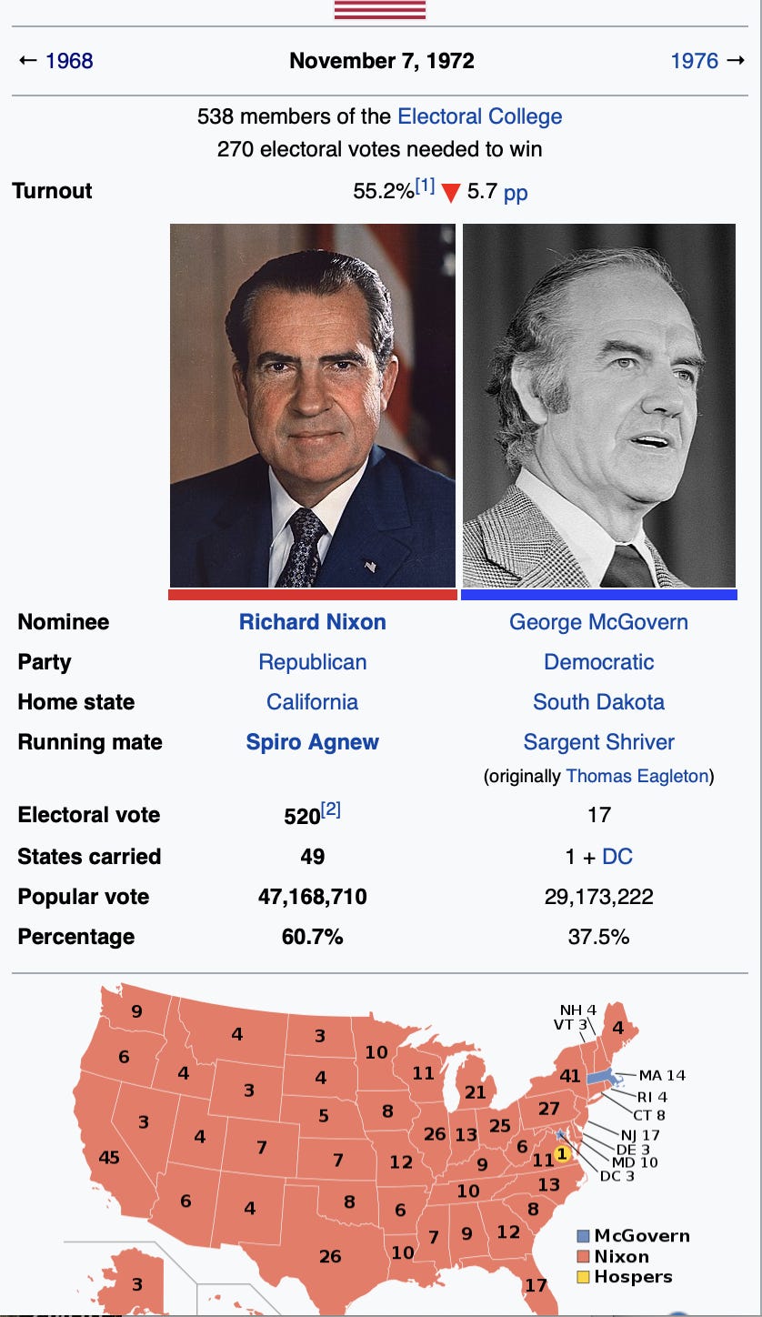 The loss of McGovern was demoralizing for the Democrats, but especially so culturally, with the likes of the counter culture revolutionaries, and people like Hunter S. Thompson. Many of them simply gave up and tuned out, went to California, joined cults and religions. But Nixon was holding onto presidential power even if American culture was still very much caught up in the radical 1960s that inspired it.