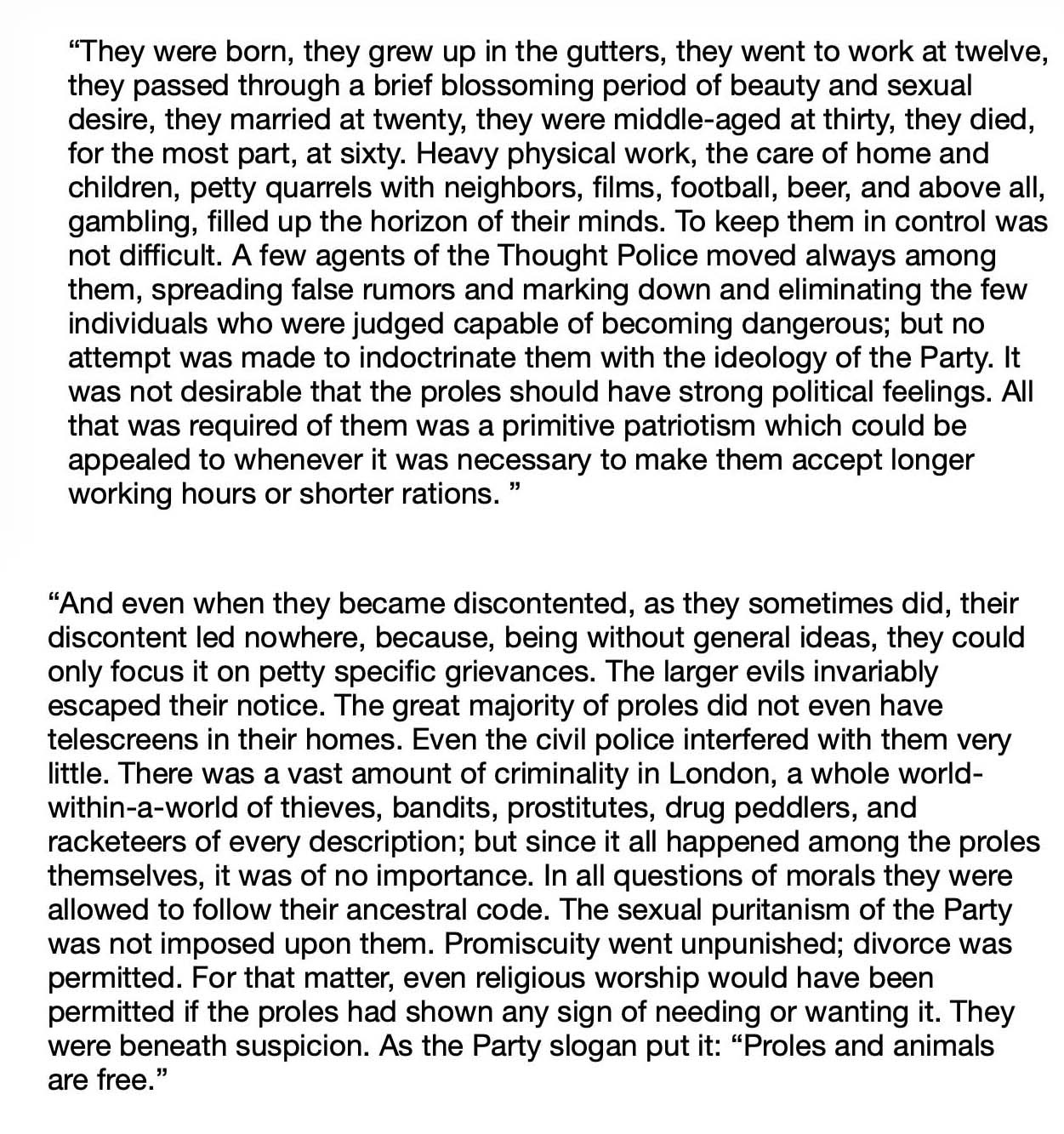 Who is allowed into the “inside” world will depend on ideological compliance at the hands of the Left and the Democrats if they are allowed to remain in power? Just like in 1984, the working class majority exists “outside.” Orwell called them the Proles: