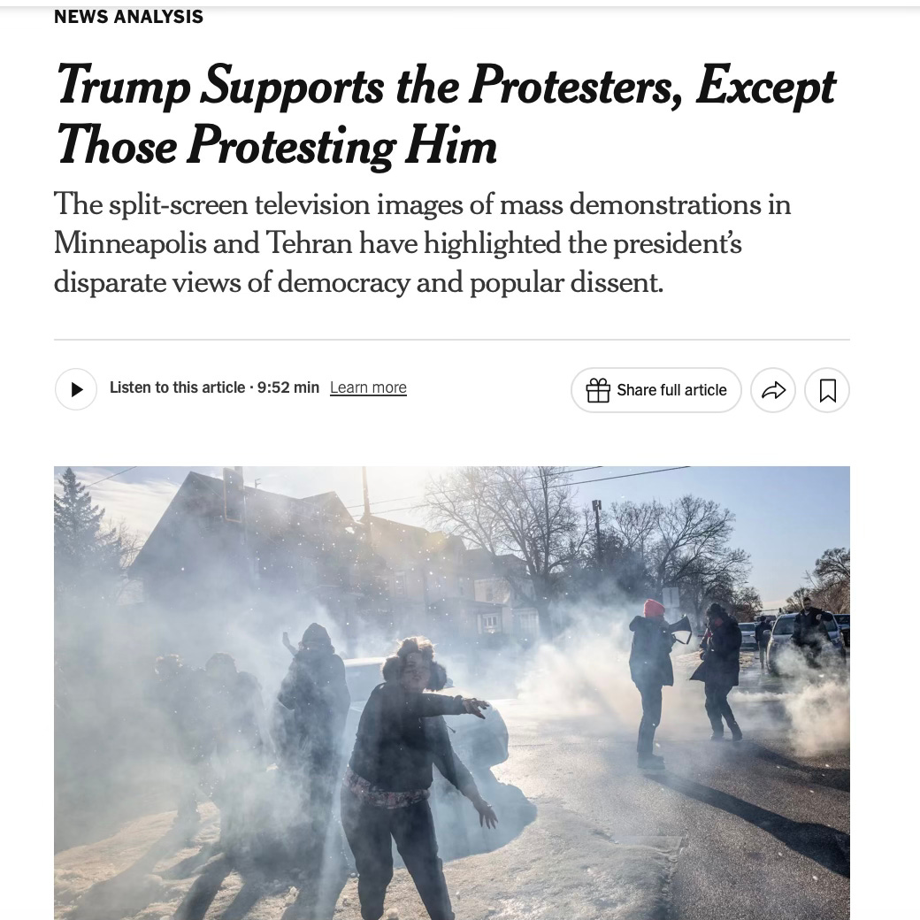 The eruption of protests on opposite sides of the planet at this moment in history has brought Mr. Trump’s views of democracy and popular dissent into stark relief. The situations in Iran and Minnesota, of course, are different and complicated, but the president’s rule of thumb seems simple enough: Those who take to the streets supporting a cause he favors are laudable heroes. Those who take to the streets to oppose him are illegitimate radicals.