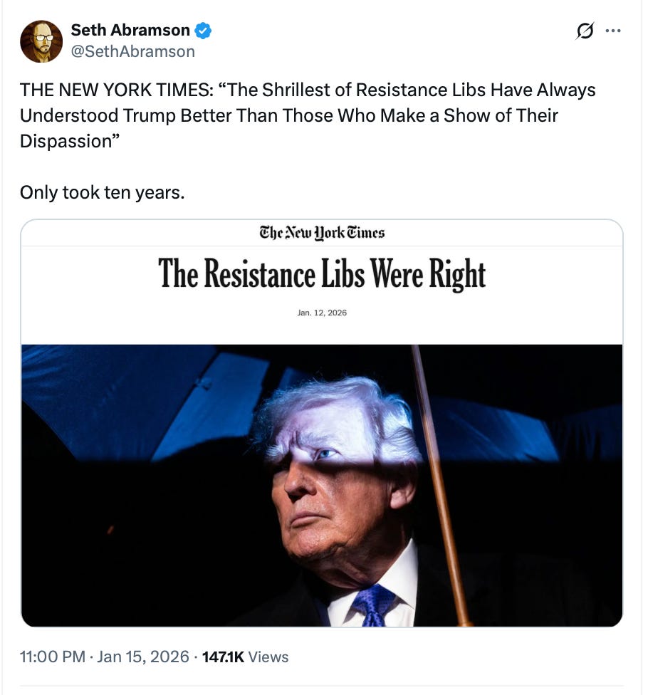 But that’s just another day at the New York Times. I know you didn’t write this piece, Michelle Goldberg did, but it is worth mentioning as an aside that no, the “resistance libs” were not right. They were never right. I was one of them until I wasn’t. It’s been an ugly road out of the Doomsday Cult of the Left, but now, I live free as an exile.