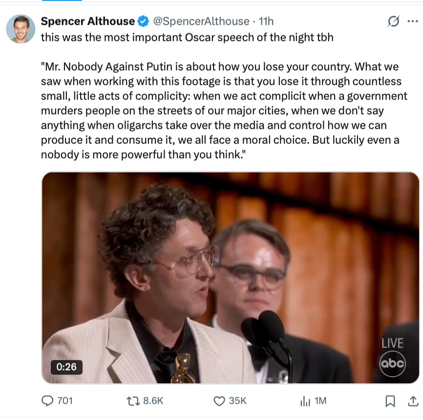 Jessie Buckley had a nice speech about motherhood. Otherwise it was all TDS slop. The decline of best picture winners after 2013 is staggering: https://yuribezmenov.substack.com/p/oscars-best-picture-slop-2000-2025