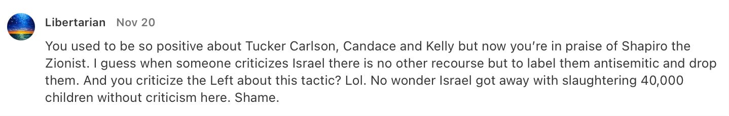 Having said that, that both the Left and the Right have now decided Israel is the enemy, genocide has been committed, and it is all of our moral duty to stand with Palestine, is bizarre to me. Why this war? Why not every other war we’ve all lived through? Why not every other dead baby?