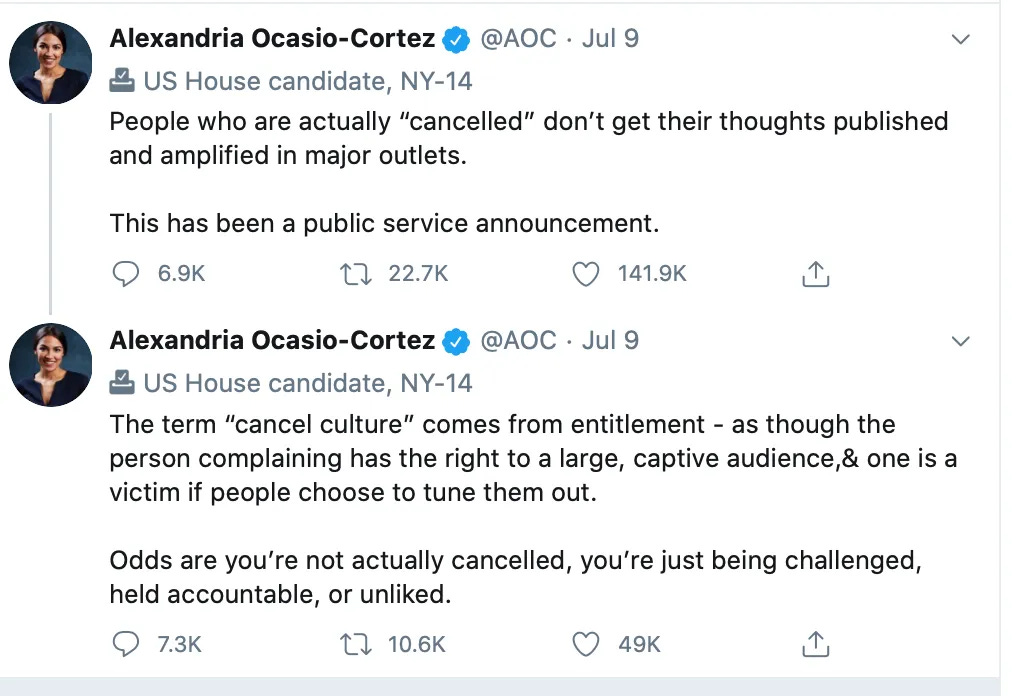 In July 2020, I was already worried about AOC’s public embrace and defense of “cancel culture.” What does that mean when a member of Congress says it on Twitter? Where will that go, ultimately, I wondered.