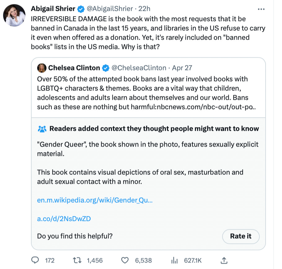 Translation: We are the ones who get to censor books by changing words and deciding whether or not certain books like Irreversible Damage should be blocked from public view.