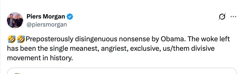 But Obama’s reality disconnect came when he appeared on the Brian Tyler Cohen podcast and said the “other side does the mean, angry, exclusive, us/them, divisive politics,” and his side doesn’t.