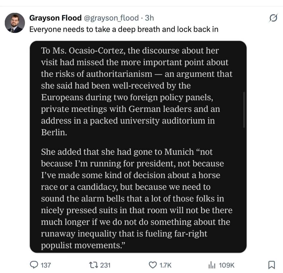 None of the Dems in Munich distinguished themselves. AOC raised her profile with the same “short clips” she decries—vibing while she knits and simplifying governance to soundbites of remarkable vacuity.