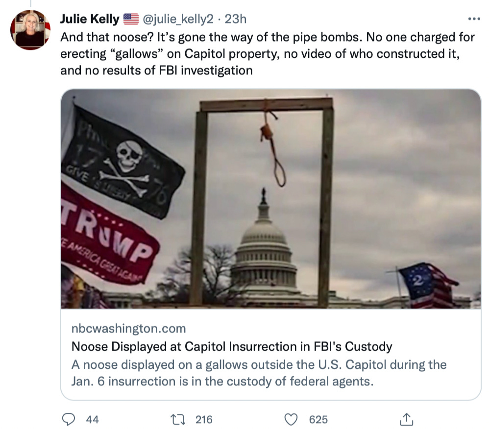 There were supposedly pipe bombs placed in buildings in DC, where there were plenty of security cameras. Whatever happened to that investigation? Julie Kelly on Twitter also asks the following question:
