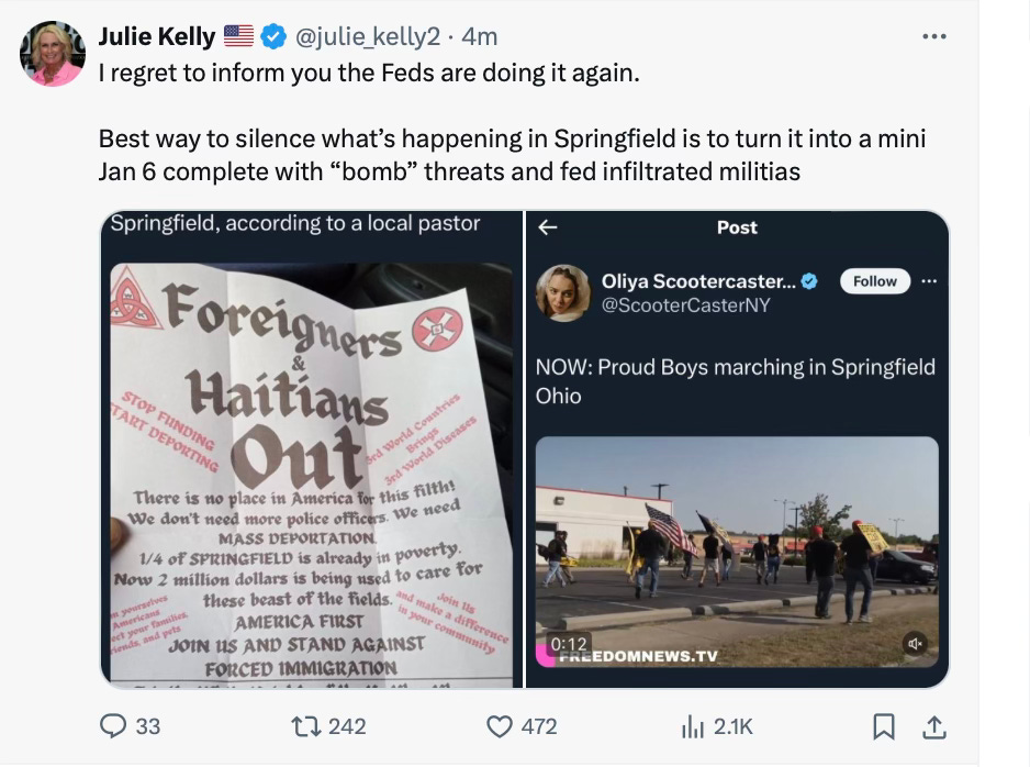 A) Trump said the bad thing, B) his supporters obey his every command and now an army of armed Proud Boys Nazi Brown Shirts are going to Springfield to terrorize the Haitians.