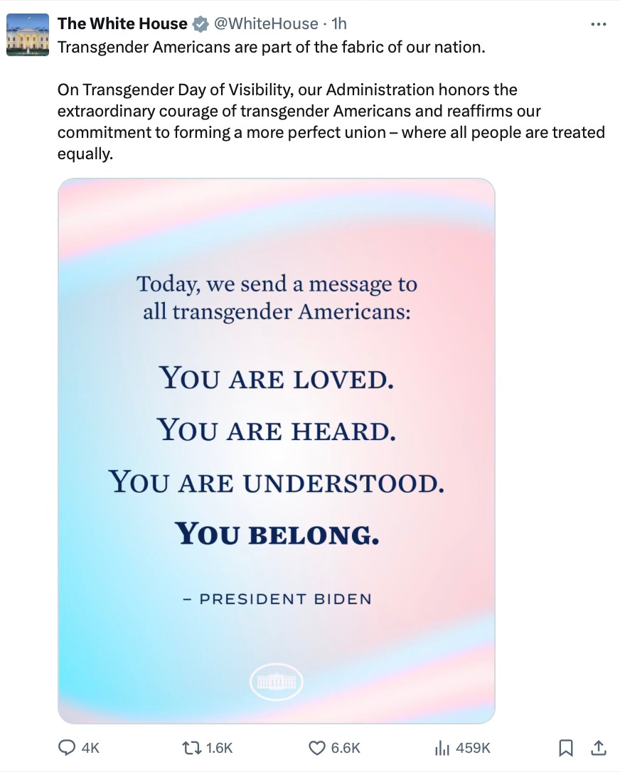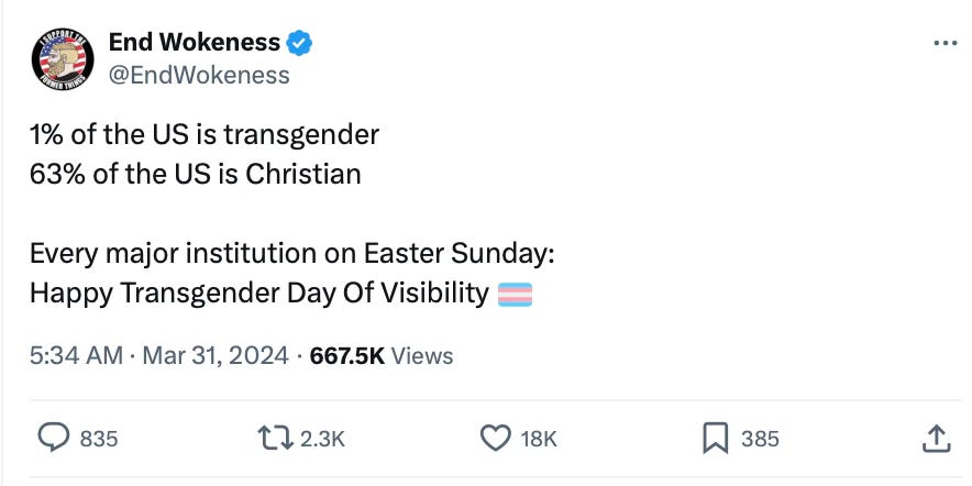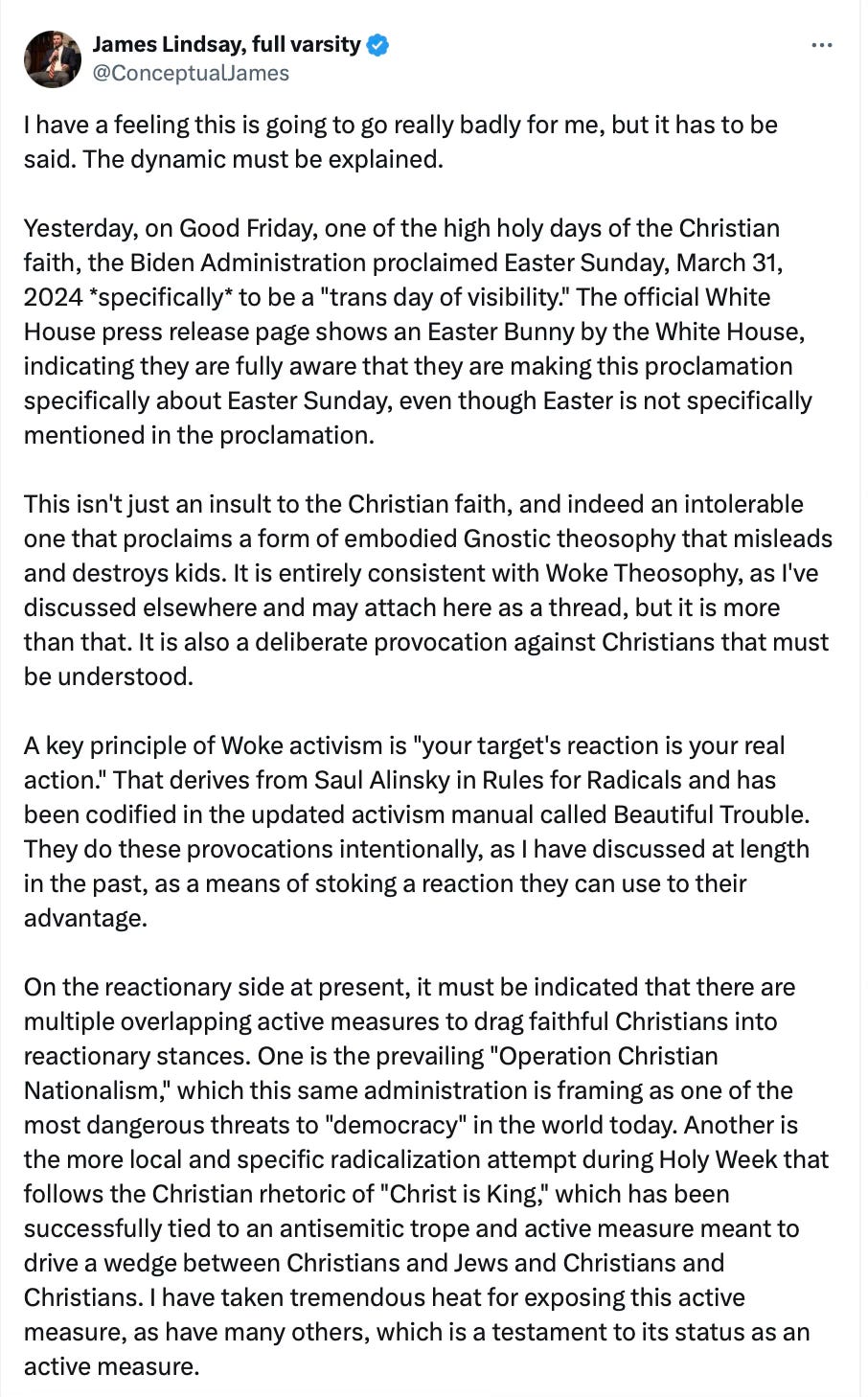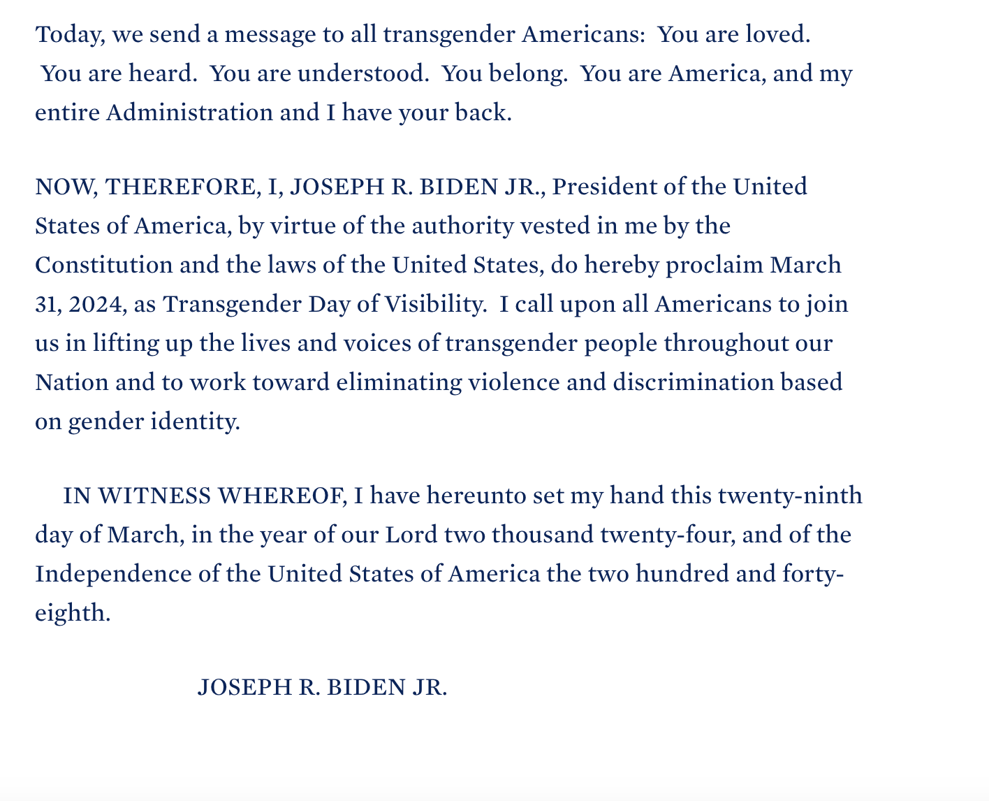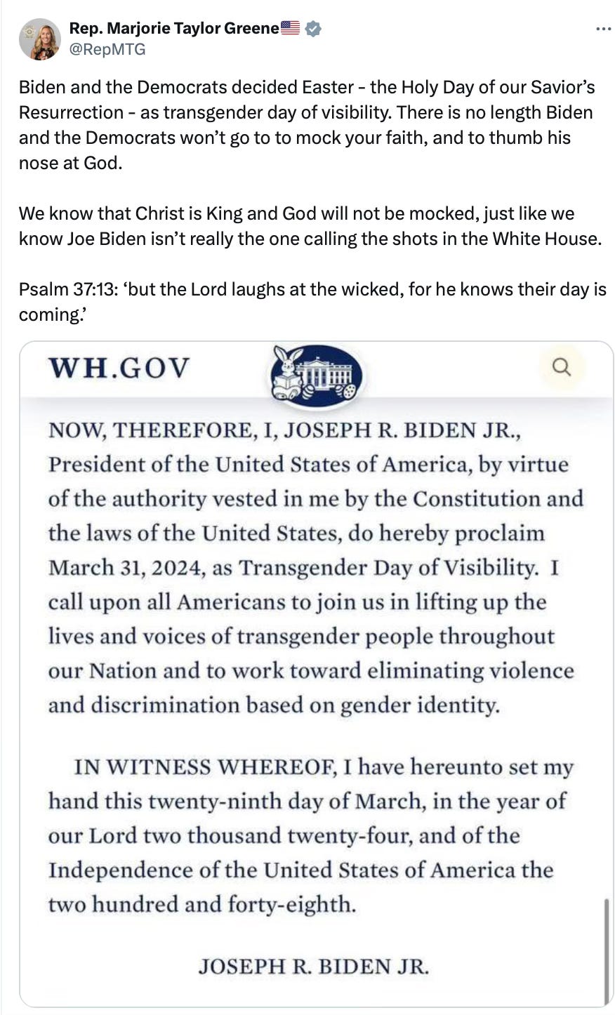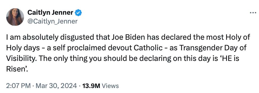 And there it was, Transgender Day of Visibility, which always falls on March 31. Biden could have made it official any time in the past four years, yet he chose this day because it collides with Easter Sunday.