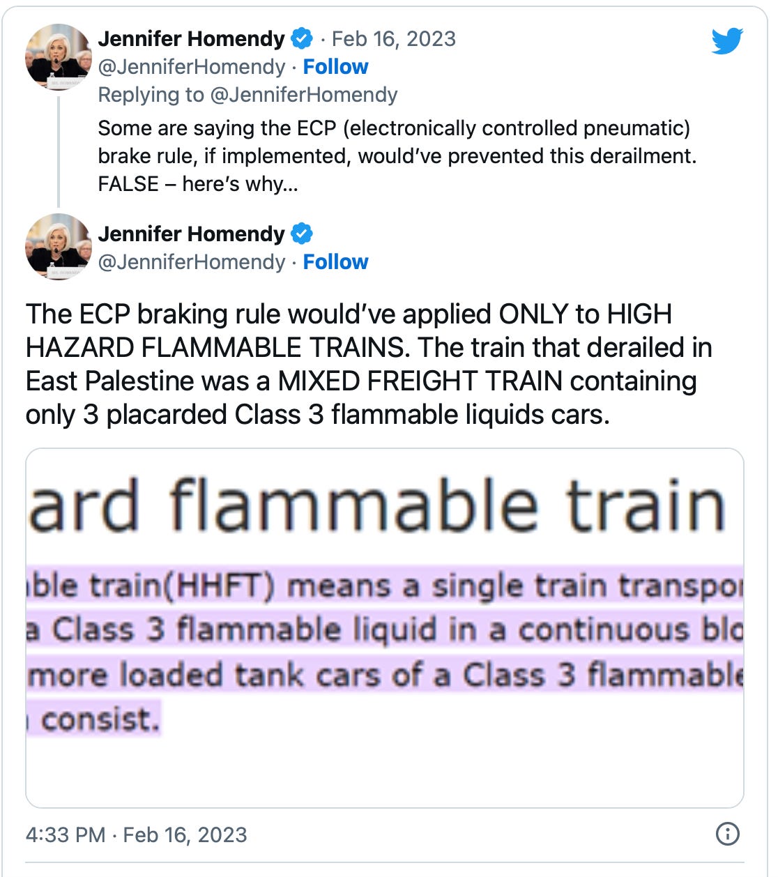 It is true that the Trump administration scrapped electronic braking regulations for trains carrying large amounts of hazardous liquids. But National Transportation Safety Board chairwoman Jennifer Homendy, who was appointed by Biden and unanimously confirmed by the Senate, said the rule wouldn’t have applied to the Norfolk Southern train that derailed in East Palestine on Feb. 3.