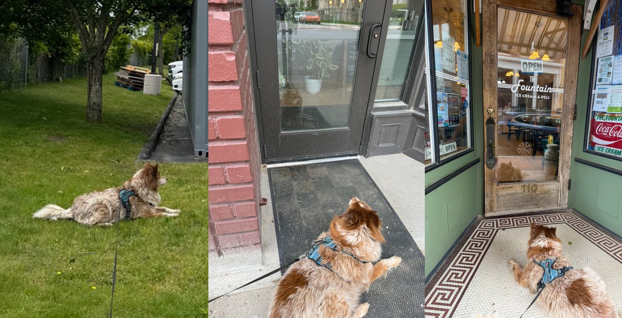 Here he is during our road trip, watching the doors she went through, patiently waiting for her return.
