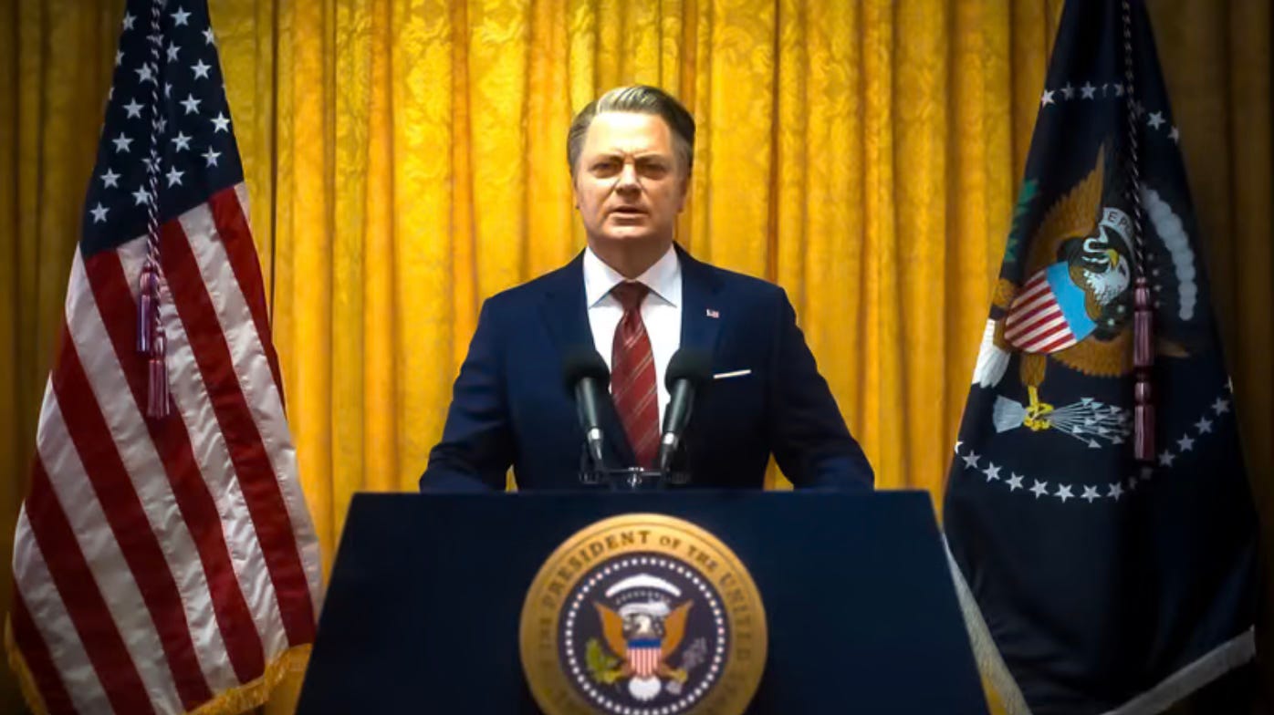The President is a white guy, of course, because the only bad guys in the movie are white guys, and he references God, which no Democrat would do in a movie like this. That is one of the clues that he’s meant to be a Trump-like figure. The other clue is that he’s violating the Constitution and serving a third term.