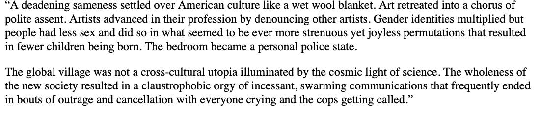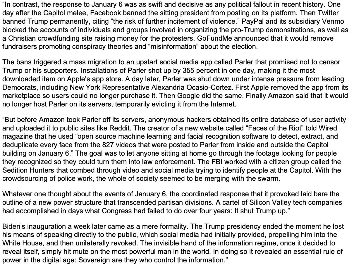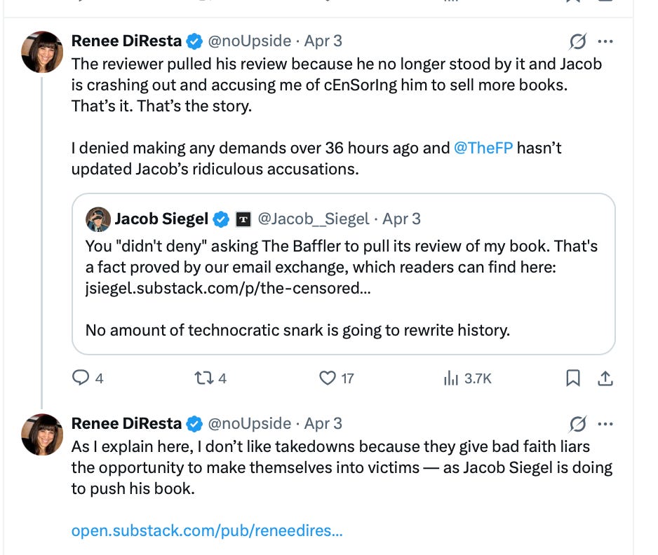 As if out of a chapter in his own book, Renée DiResta objected to how she was portrayed and wrote a letter of complaint to the website Baffler, which then pulled the review. Siegel and DiResta publicly debated whether it counted as censorship. But who needs censorship when you have total societal control? At least among the university-educated ruling class.