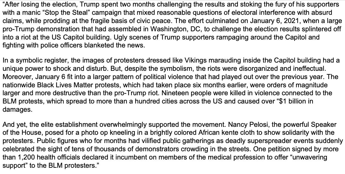 The BLM riots attacked working-class people, so they didn’t matter, but January 6th attacked the powerful, and that, to them, meant war.