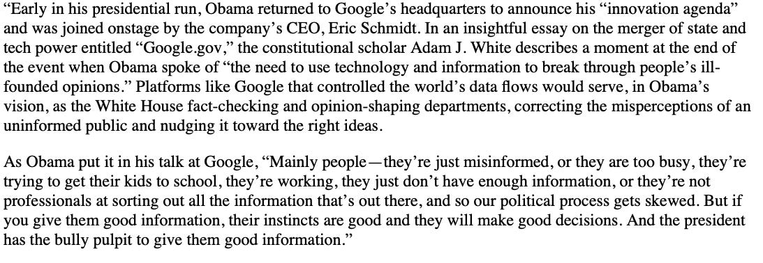 The Information State starts with Woodrow Wilson’s Great War crackdown on speech, and moves through World War II, Harry Truman and the Cold War, up to 9/11 and the expansion of the surveillance state. But it was the Obama administration that took it much further, beyond mere surveillance. He used information to change hearts and minds and to create a utopian society, not unlike those of the Soviet Union or China.