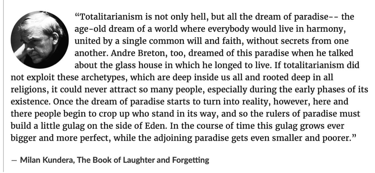 Utopias only have two paths forward. They either collapse or they must become more totalitarian out of necessity, to quote Milan Kundera in The Book of Laughter and Forgetting.