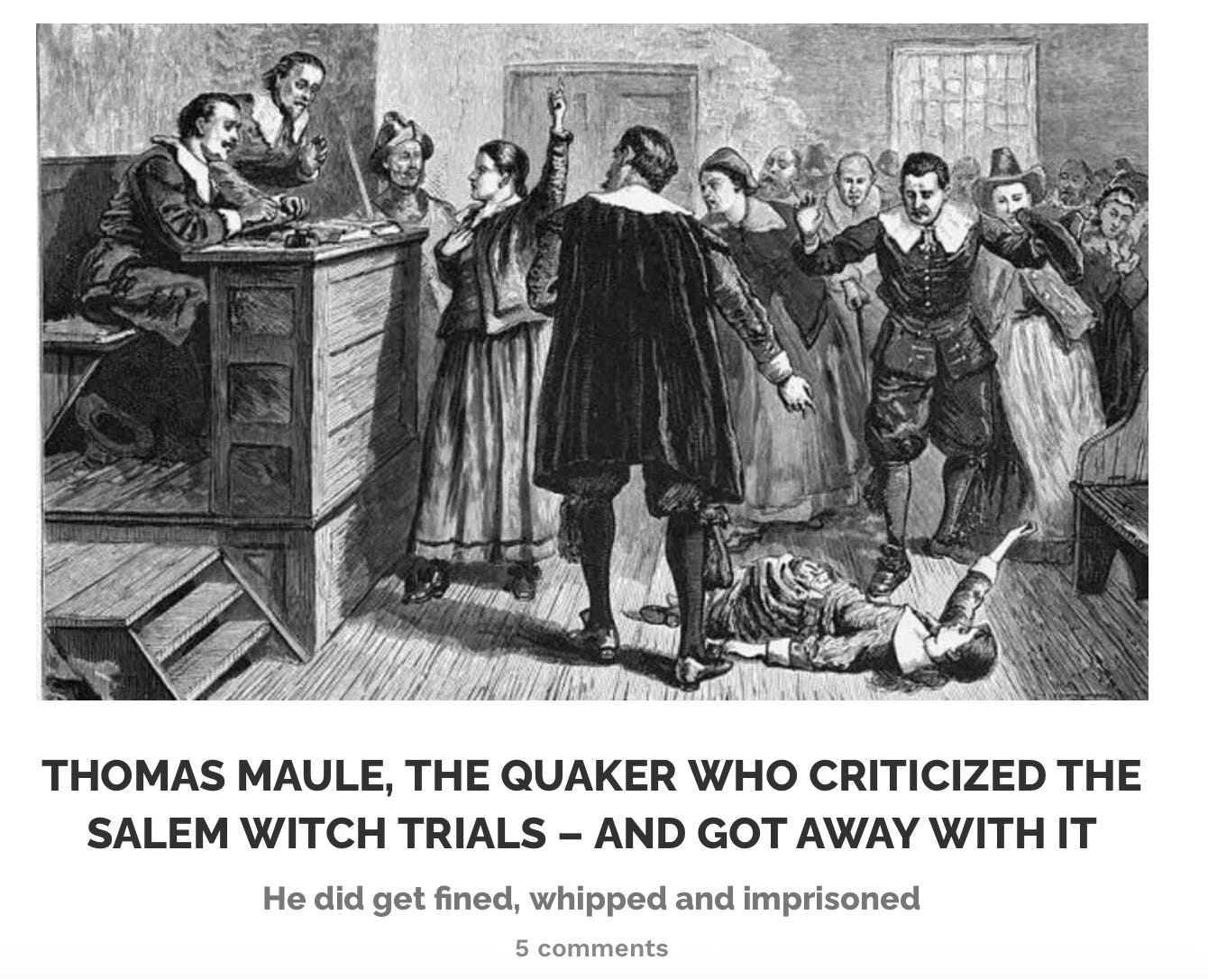 The scandal of how 20 people were hanged as witches in Salem would have been long forgotten, were it not for a cantankerous Quaker named Thomas Maule, who made the brave choice to expose the scandal in a pamphlet he called Truth Held Forth and Maintained.
