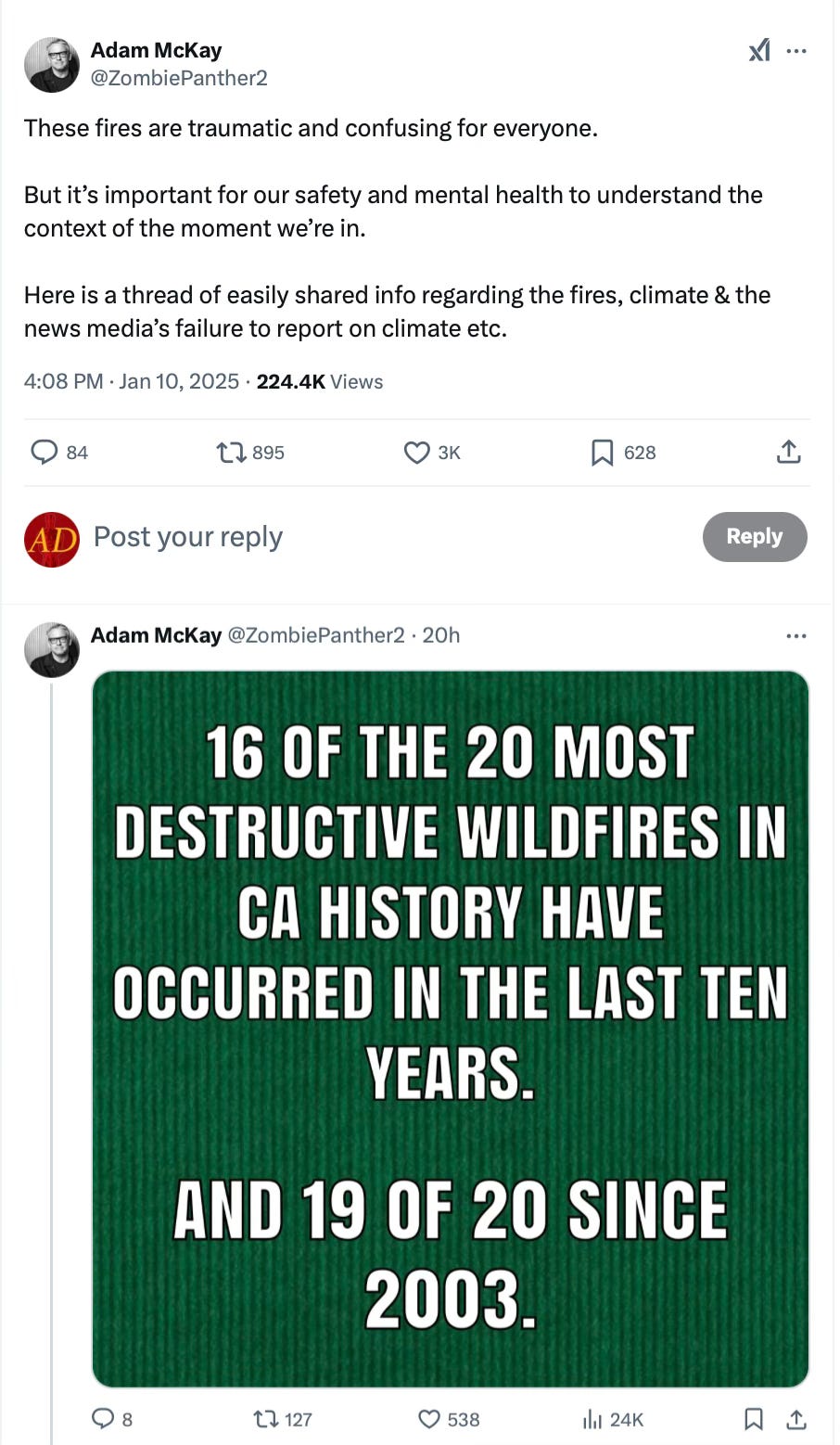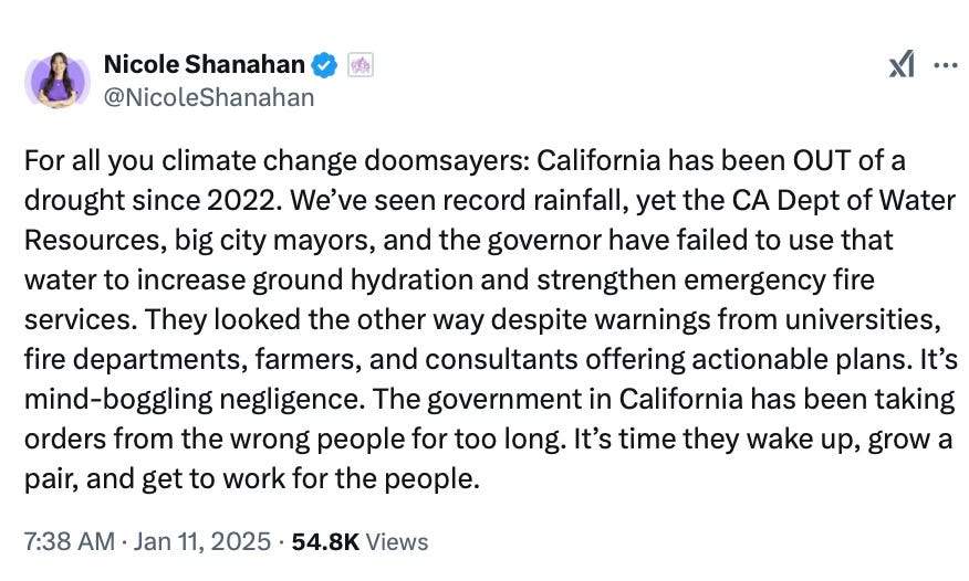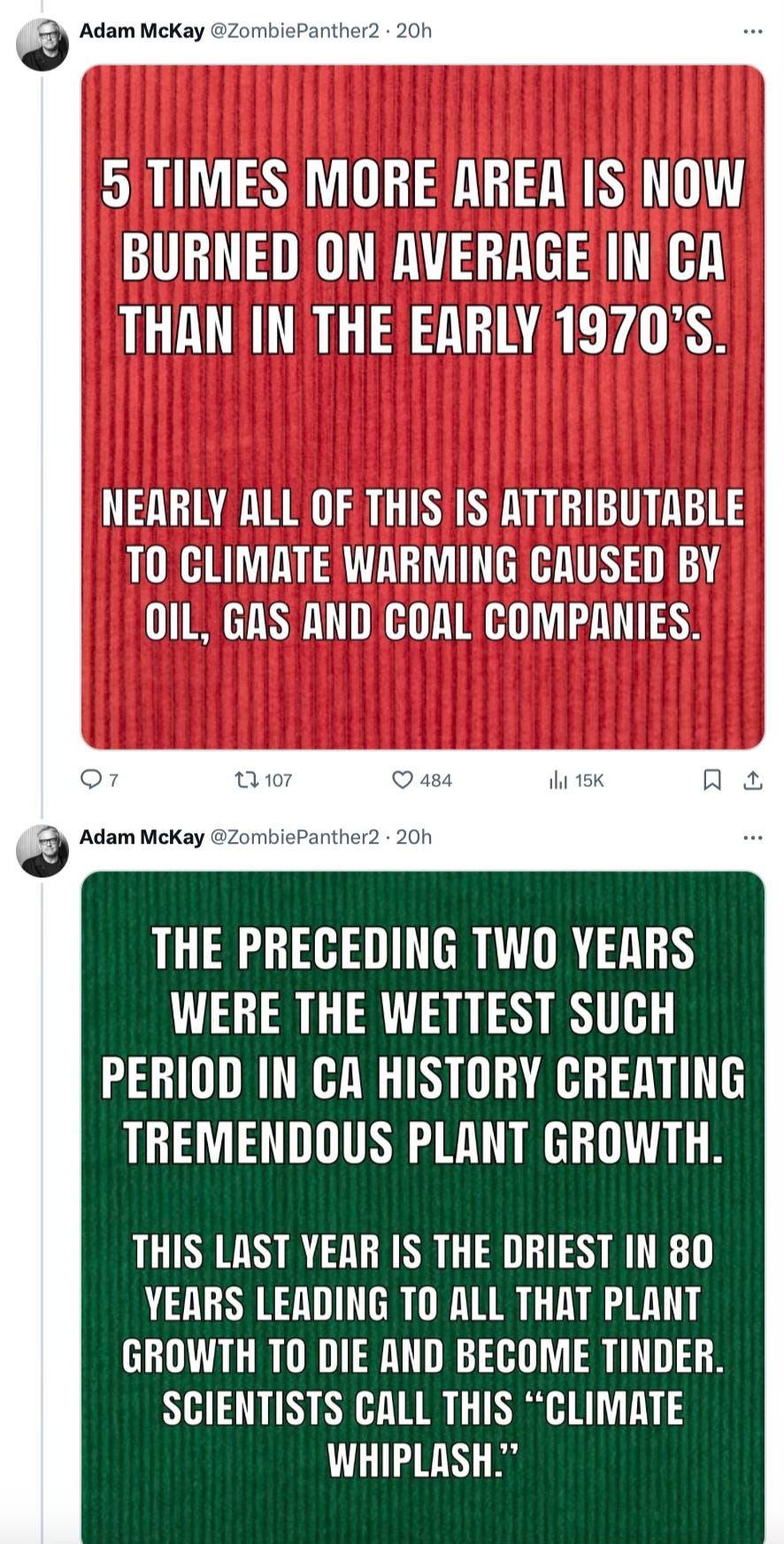 What do we have to show for it? Nothing. We have an industry devoted to absolving the rich of their sins of wealth—DEI and hybrid SUVs. We have actors like Leonardo DiCaprio broadcasting their concerns on Instagram. We have film directors like Jim Cameron and Adam McKay saying, “I told you so,” and we’re supposed to do what? Keep listening to them as our leaders fiddle while LA burns?