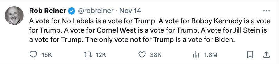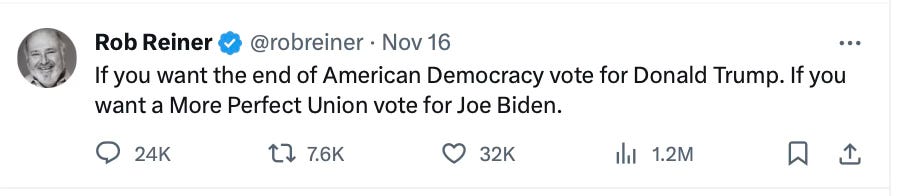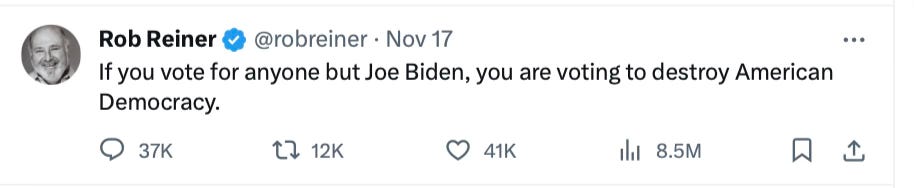 DEMOCRACY, says the Meathead Prince, can only be achieved if we destroy it to save it. Destroy it by demanding people vote for the old man or else;