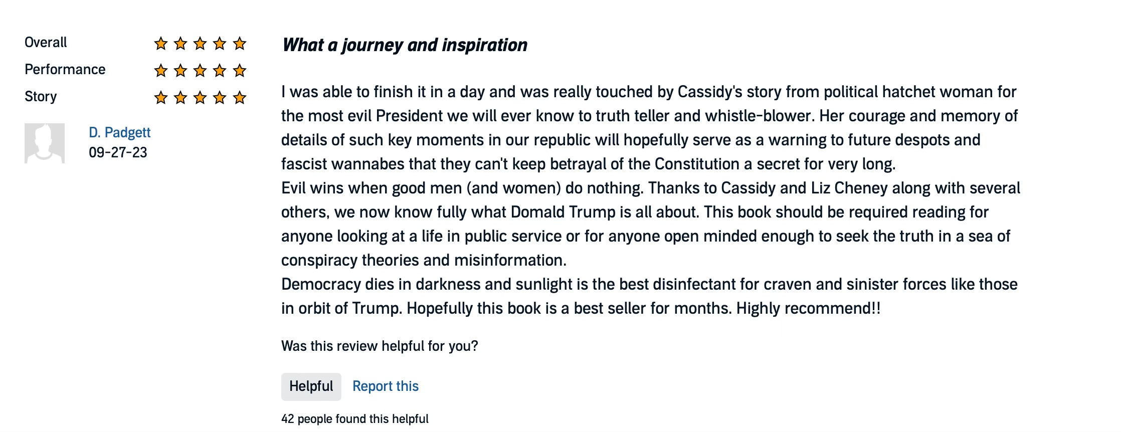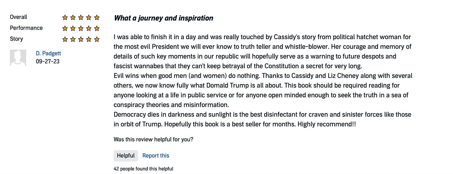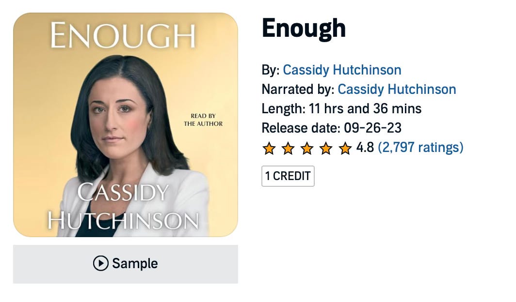 CASSIDY HUTCHINSON: MY BOOK is one of the top Audible listens. You know, Audible? Owned by Jeff Bezos, who also coincidentally owns The Washington Post and Amazon?