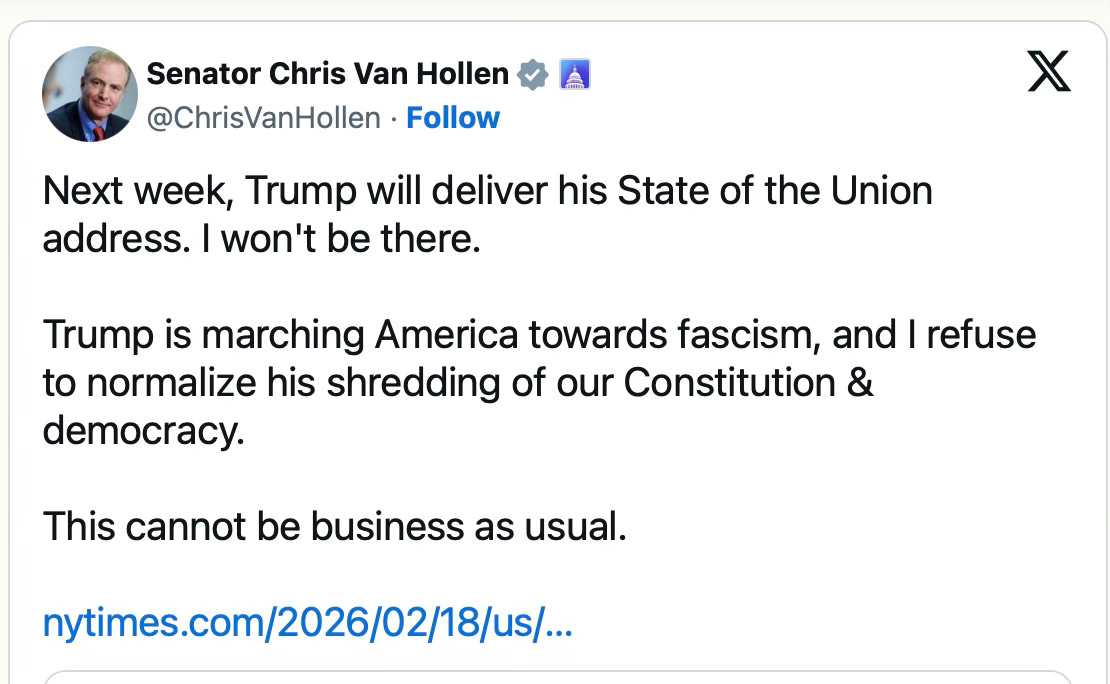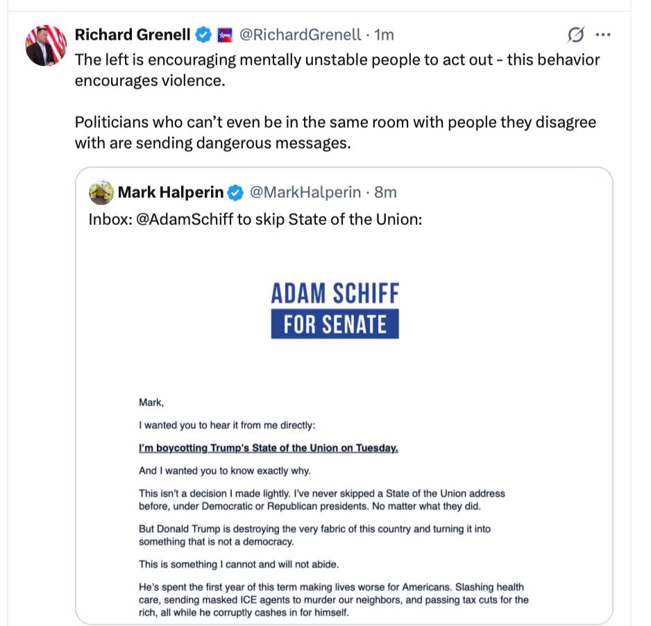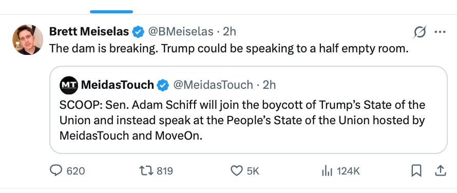 Senator Adam Schiff has announced he will boycott Trump’s State of the Union, joining a growing list of, it must be said, weak and unappealing Democrats no one feels inspired by or wants to vote for.