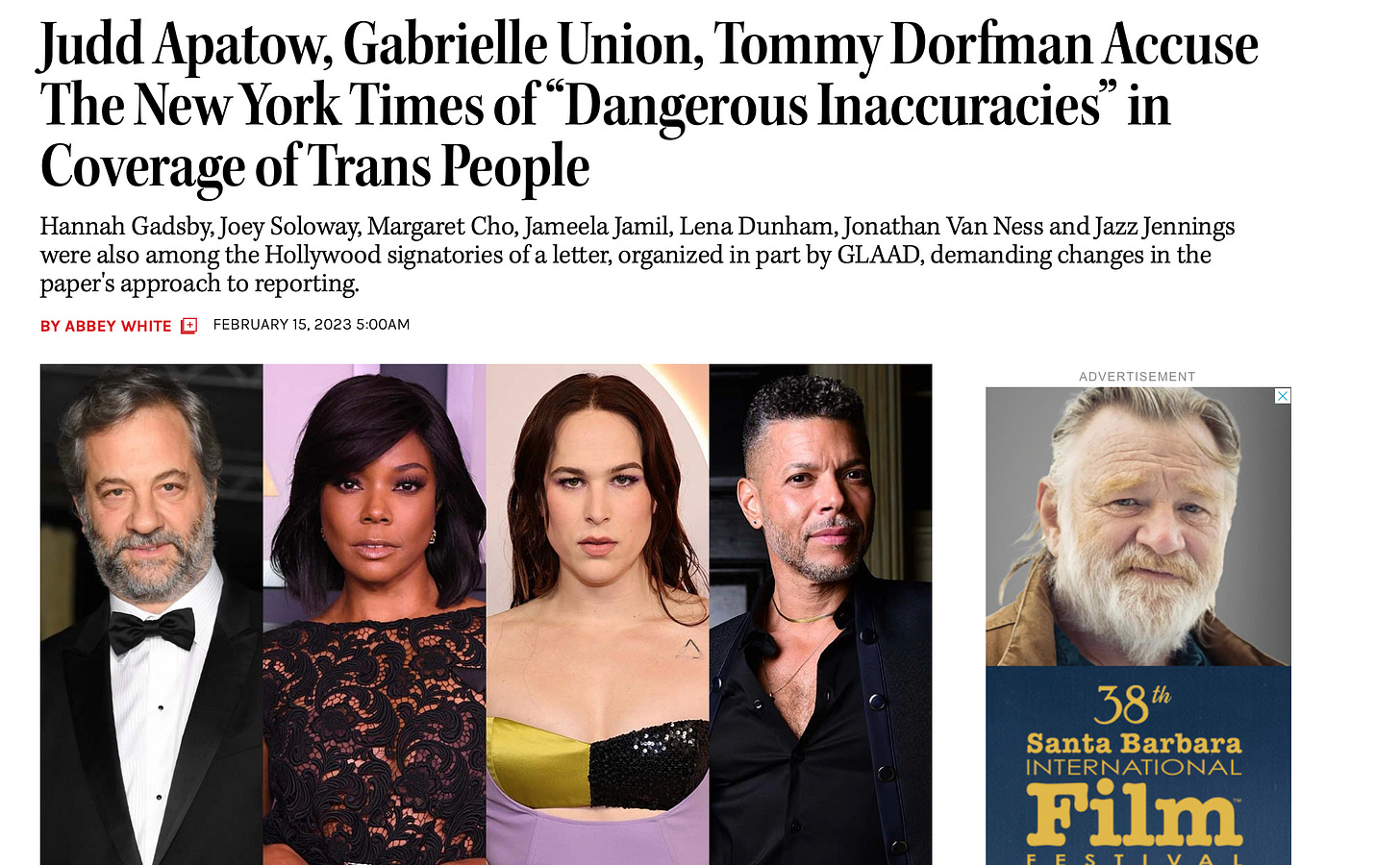 If you don’t think it’s a cult, just today, the Hollywood Reporter published a letter from celebrities demanding the already OH SO WOKE COULDN’T POSSIBLY BE MORE WOKE New York Times change their coverage of transgender issues: