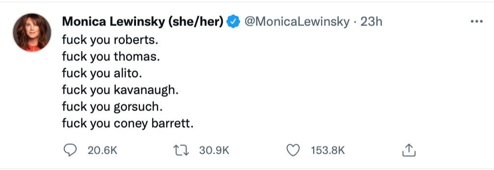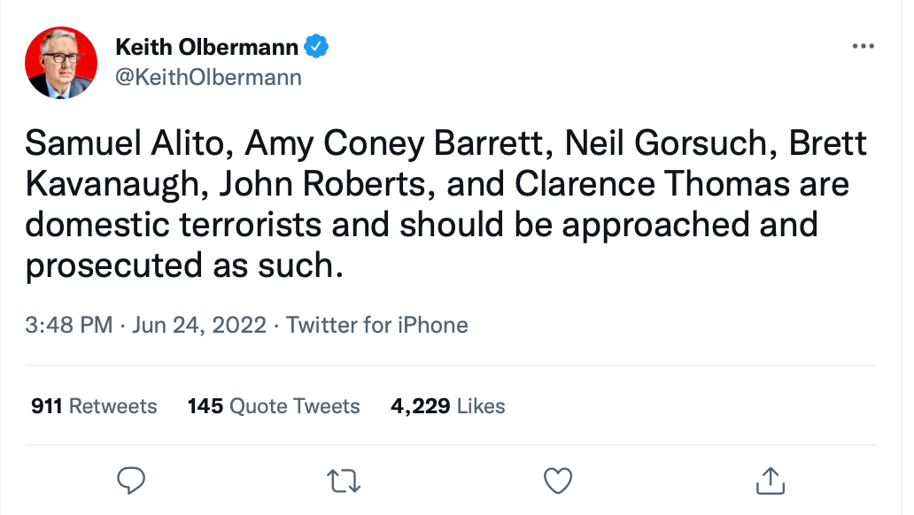 For several years now, Justices Kavanaugh, Gorsuch, Barrett, and Thomas have been casually, routinely bullied in the press, harassed, and all but crucified by the Left on a daily basis. Because of their hatred of Trump, they have normalized dehumanization against his supporters, and his appointees. Whatever they think of Trump, however angry they feel about Mitch McConnell blocking Merrick Garland’s appointment but going along with Trump’s, treating Supreme Court Justices this way undermines their claim to care about “Democracy Itself.”