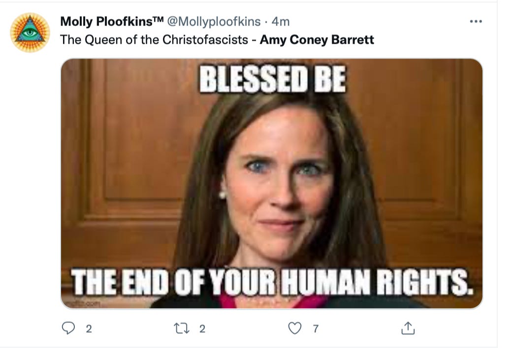 When Amy Coney Barrett was being confirmed, she was labeled a racist (even though she has adopted Black children — even that was condemned), the media said she belonged to a religious cult and was called Lydia from the Handmaid’s Tale.