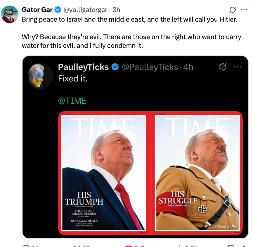 I don’t happen to think his TIME cover is so bad. To me, it looks like he’s looking to Heaven, and there is a halo around his head. But why should he trust any of them after ten years of attempting to destroy him through imagery? A day before, TIME tweeted this out: