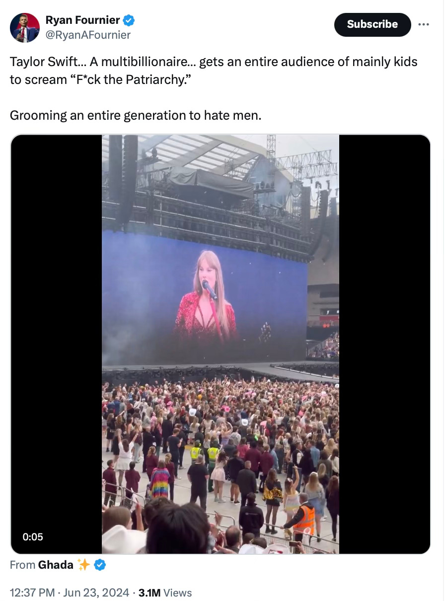 It’s probably easier to “sour grapes” the Swiftie fandom, but do you really want to fight a culture war with a force of nature who boosted ratings at the Super Bowl to 150 million and is filling up stadiums all over the world?