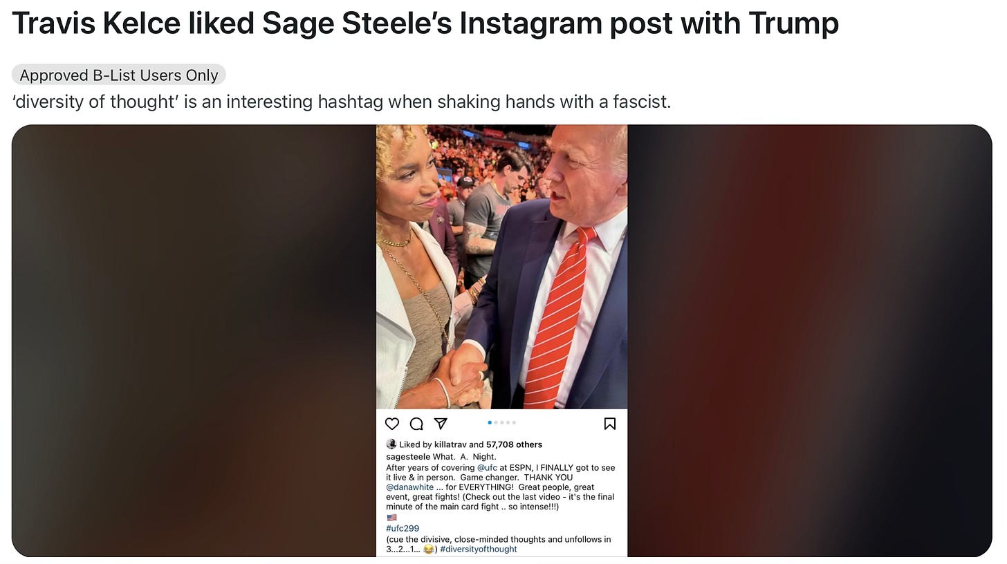 Travis Kelce has also been under constant surveillance, and social media users have noticed that he liked an Instagram post with Sage Steele and Trump. That must mean he’s a Trump supporter, the Reddit users seethed. Of course, he’s a racist, and so is she. And on and on it went. But credit to Kelce for being unafraid to support Sage Steele anyway.