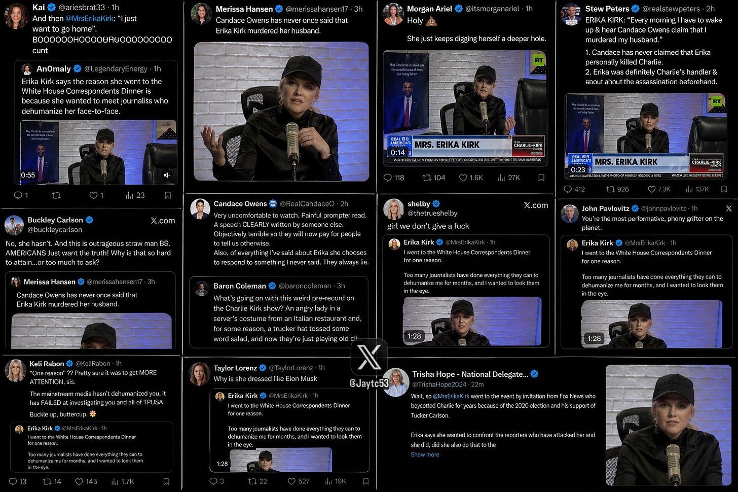 After the assassination attempt on Trump’s life, a video circulated showing Erika Kirk crying as she left the venue, “I just want to go home,” she said. Well, you can imagine what the minions of the repulsive Candace Owens did with that. Here is just a sample: