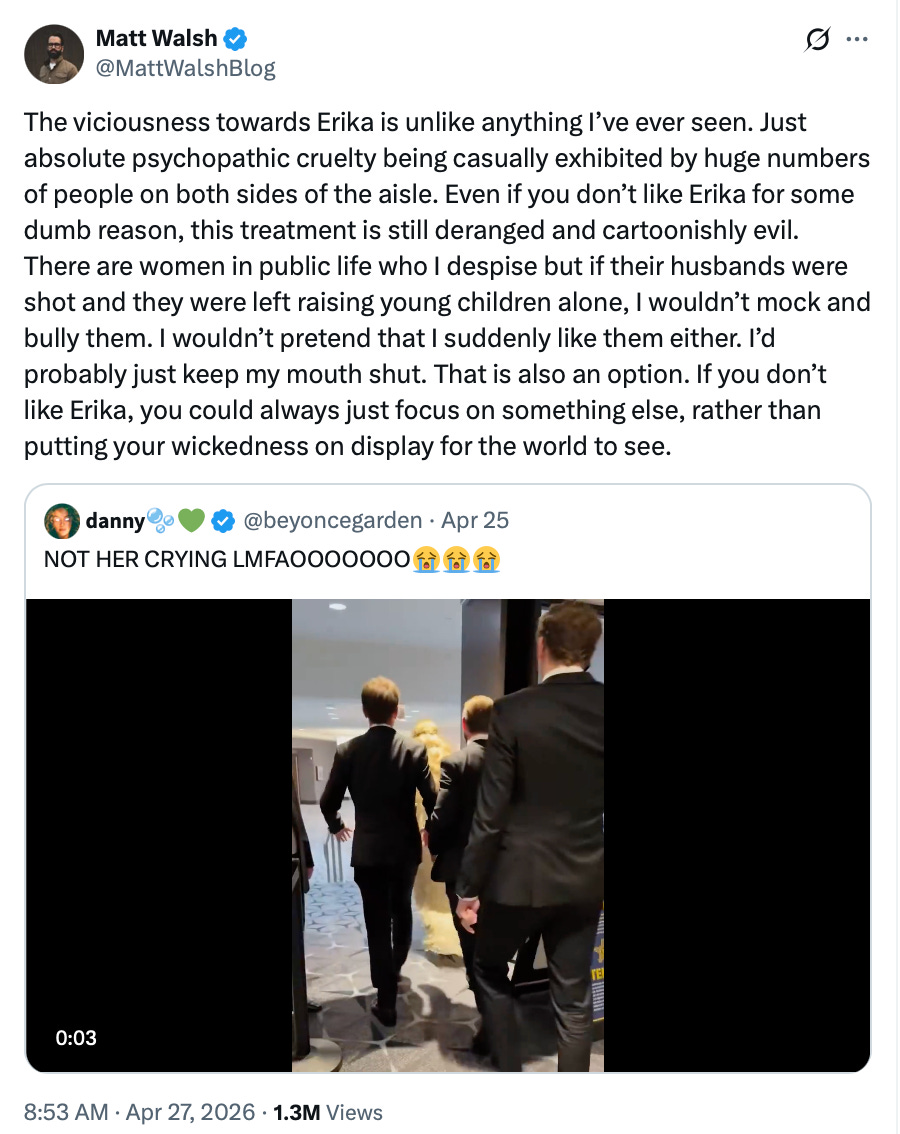 Ugliness of that magnitude is the stuff of Romans, a true low point in modern American life. No one on the Left will shame her because they could never be seen defending Erika Kirk. Many on the Right also seem hesitant to call her out, which is deeply disappointing. If you can’t draw the line there, where can you draw it?