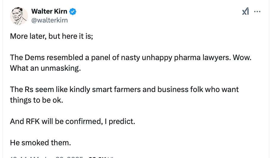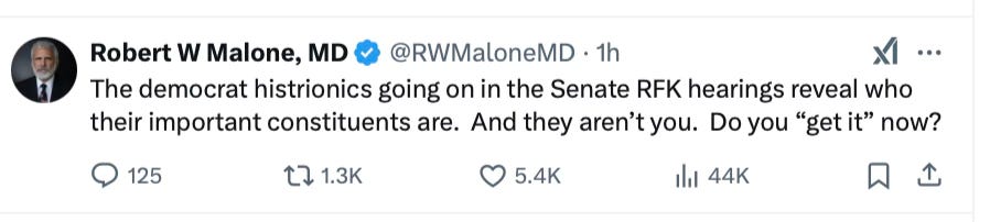 Their hostile attitude toward him was exactly the wrong play. They had this rare opportunity to bring back maybe some of the voters they lost to RFK, Jr. And yet, everything they said and did only proved that all of us who have abandoned the party made the right choice. Did a single one of them sound like they had the people’s best interests at heart? No, they didn’t. It was like every other hearing we’ve watched where the Democrats appear. They go on offense. How much better might it have been if they’d been curious about the problems we all face as Americans?